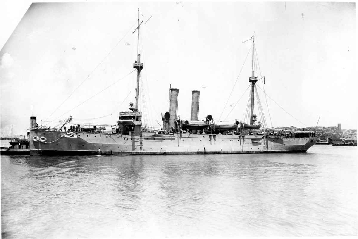 Port side view of USS Cleveland (Cruiser No. 19) in the Mare Island channel on 25 April 1914. U.S. Navy photo |