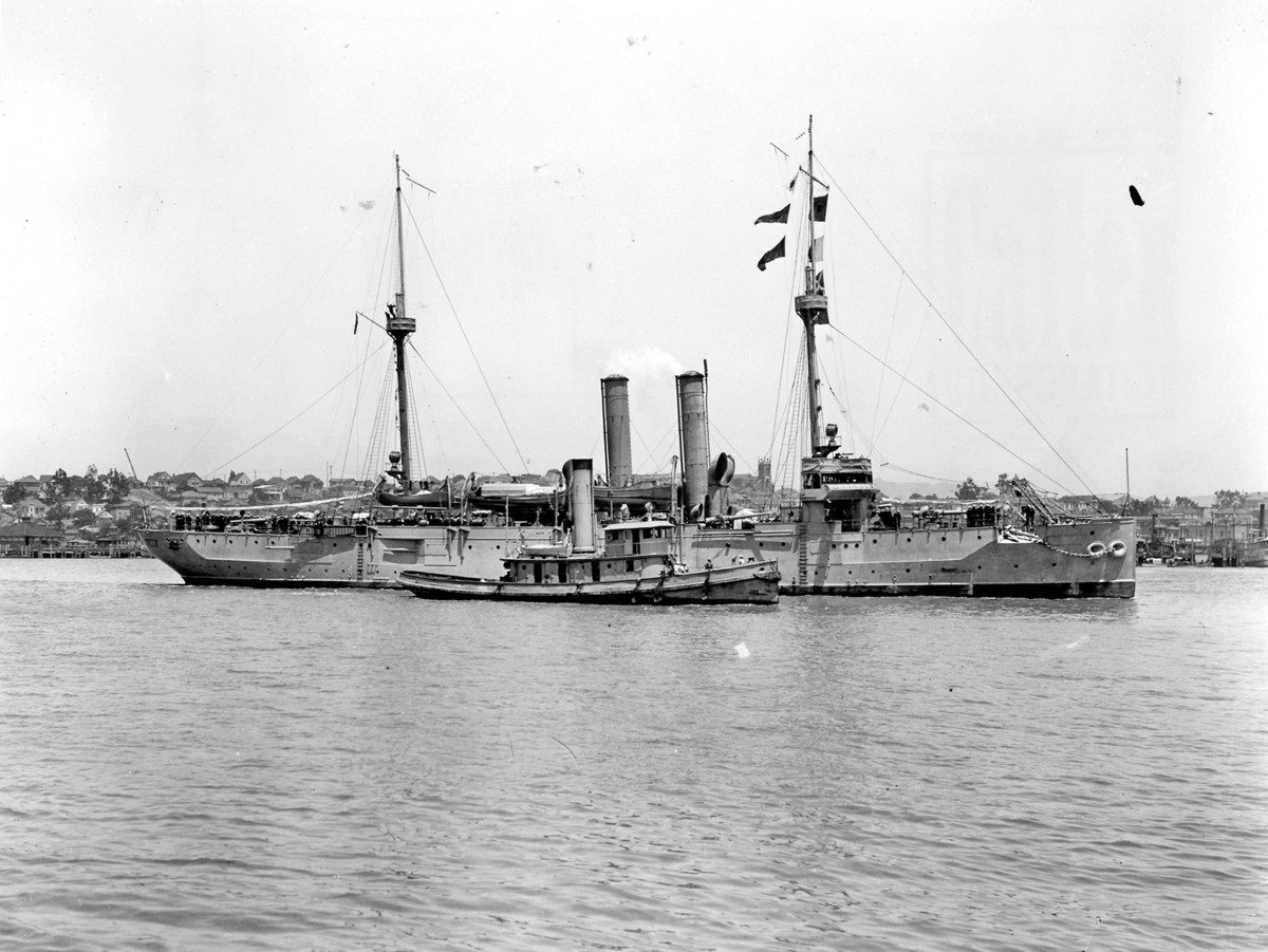 Port side view of USS Cleveland (Cruiser No. 19) at Mare Island on 7 September 1916 the tug USS Active (YT 14) is behind Cleveland. U.S. Navy Photo |