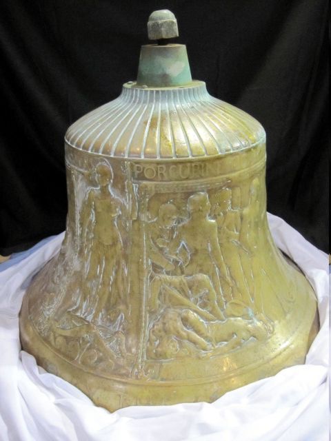 44k | Bell given by the citizens of Cleveland to the USS Cleveland (Cruiser No. 19). Bas relief depictions of Commodore Perry transferring his flag from the Lawrence to the Niagara, With inscription " We have met the enemy and they are ours." The second panel shows Lieutenant O'Keefe British Commandant of Marines tendering Commodore Barclay's sword to Commodore Perry. Inscription on bell, "If a victory is to be attained, I will attain it , " and "To the Cruiser Cleveland by the Citizens of Cleveland " From the collection of Curator Branch, Naval History and Heritage Command. | Bill Gonyo | |