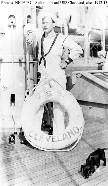 76k | One of the ship's crewmen poses with a life ring and puppy, circa 1912-1915. Collection of Hubert C. Rickert, courtesy of Daniel Rickert, 1981. U.S. Naval History and Heritage Command Photo #NH 93087. |