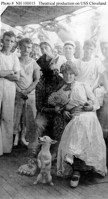 72k | Theatrical production by the ship's crew, assistance by a mascot dog, circa 1907-1909. Cleveland was then en route to, or serving in, the Far East. Copied from the Album of Assistant Paymaster Francis J. Daly, courtesy of Commander Thomas M. Daly, USN, 1984. U.S. Naval History and Heritage Command Photo #NH 100015. |