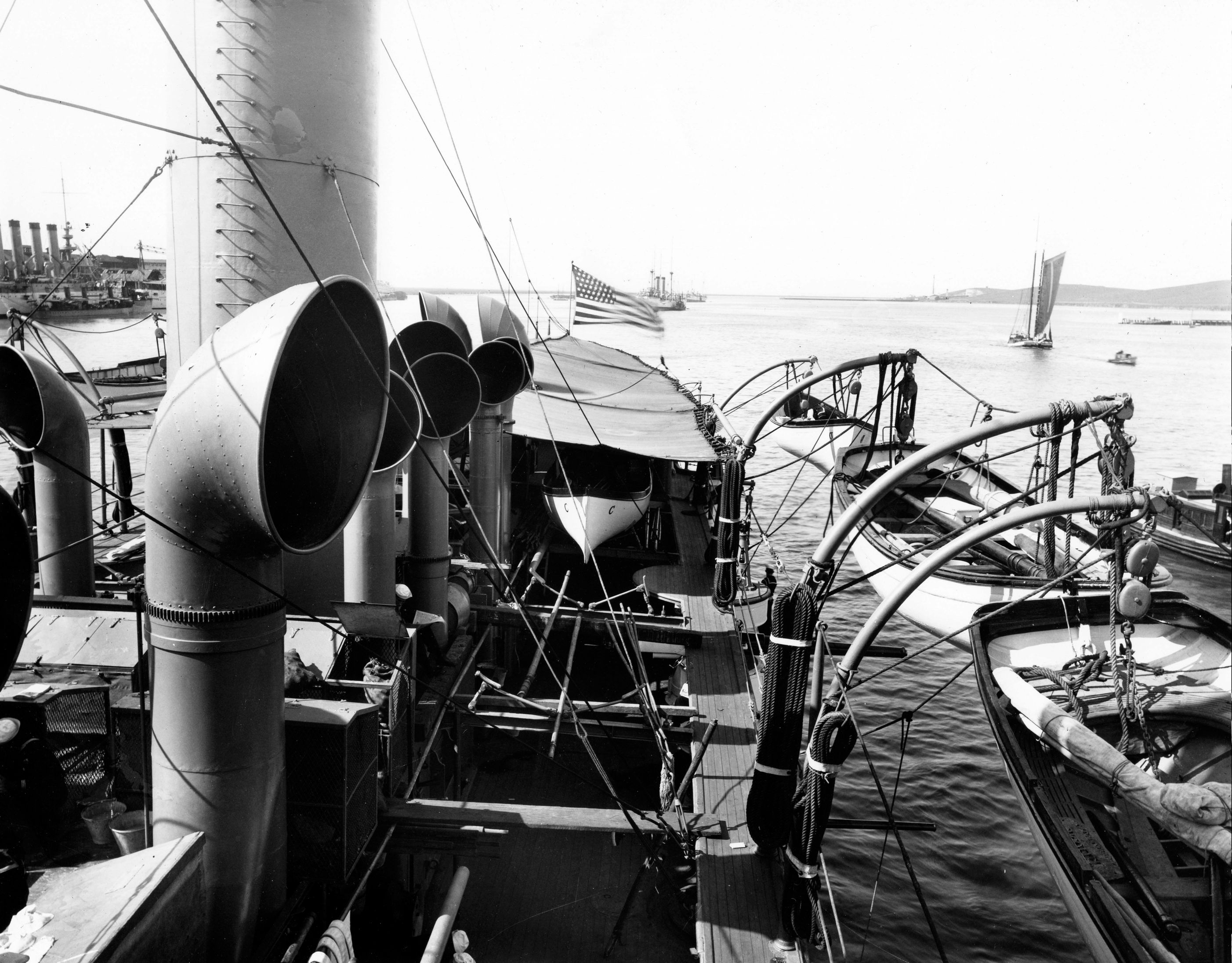 778k | Looking aft down port side while at anchor at Mare Island on 27 September 1907. | Darryl Baker | |