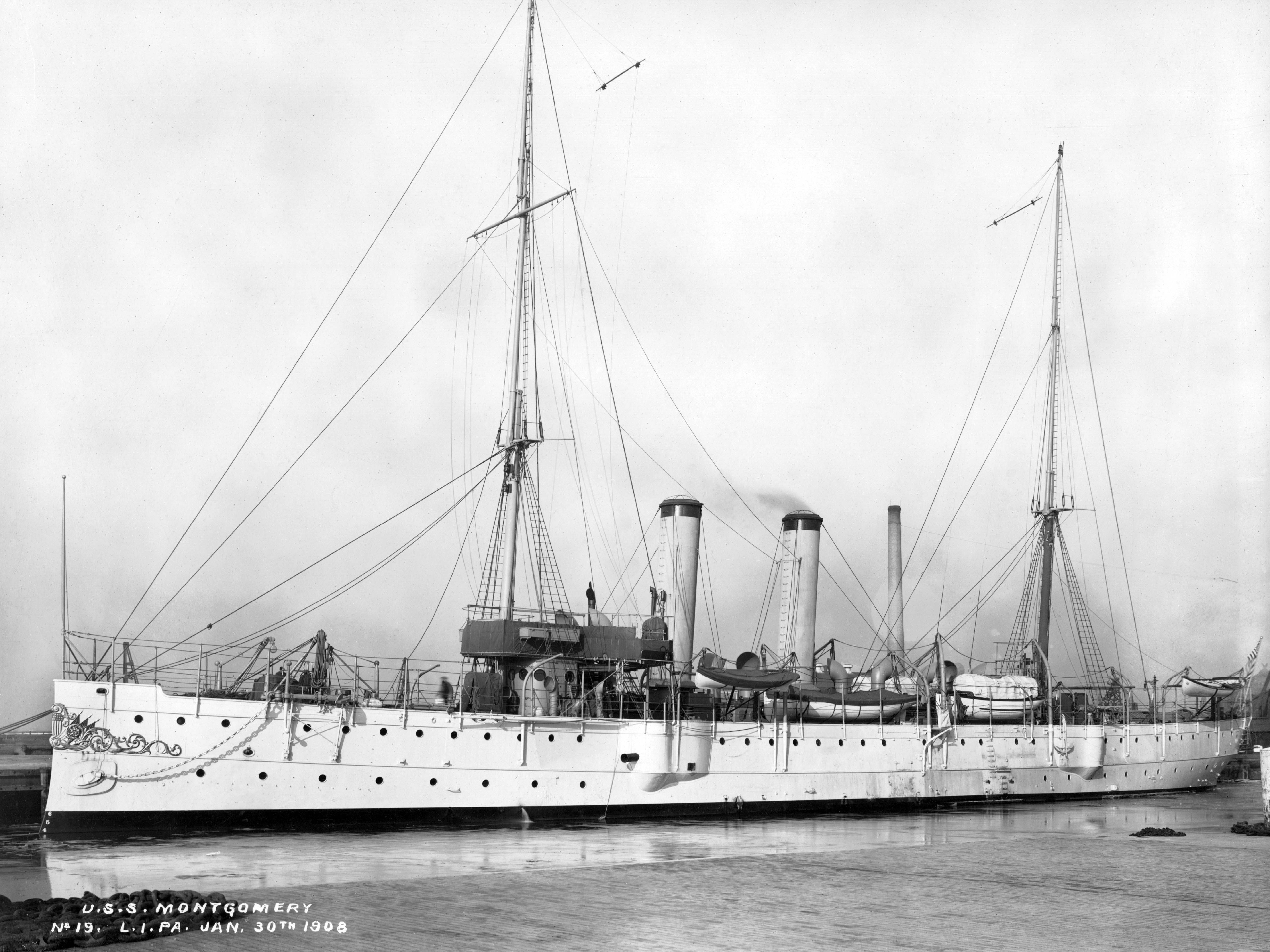 86k | USS Montgomery (Cruiser No. 9), as completed, anchored at an