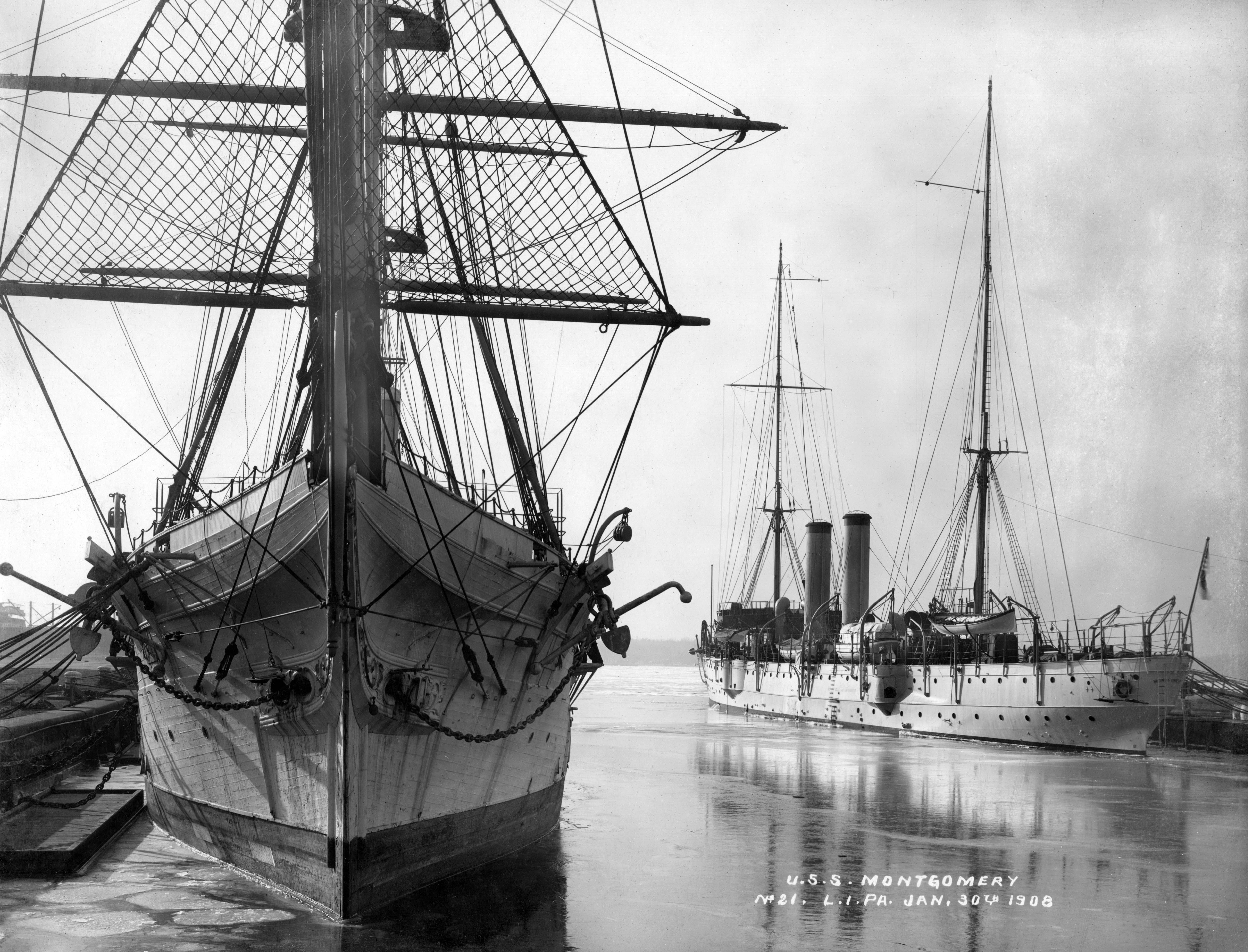 2.82k | Montgomery-class cruiser circa 1890-91. Photo by Edward H. Hart, Detriot Publishing Company Photo # det 4a14389 via loc.gov |