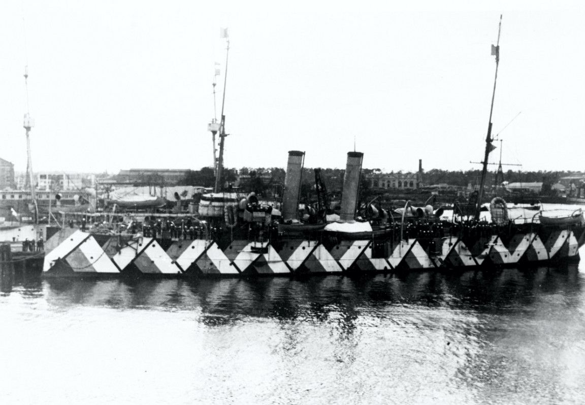 100k | USS Anniston (Cruiser No. 9), ex-USS Montgomery, wearing Watson System camouflage, 1918. Naval History and Heritage Command, Photo #NH 57227 |