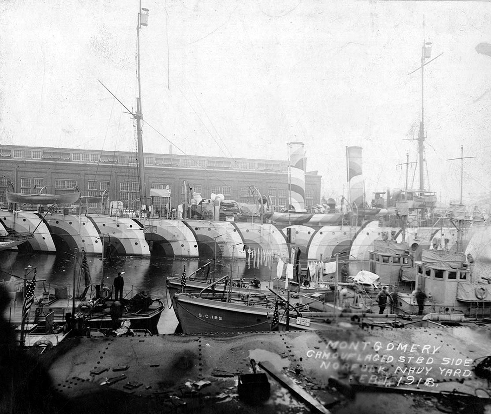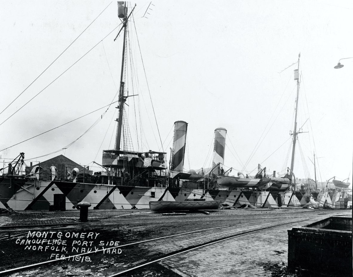 343k | Montgomery's port side showing an angular Dazzle camouflage during WWI. US "War Department" photo now in the custody of the US National Archives, College Park, MD. |