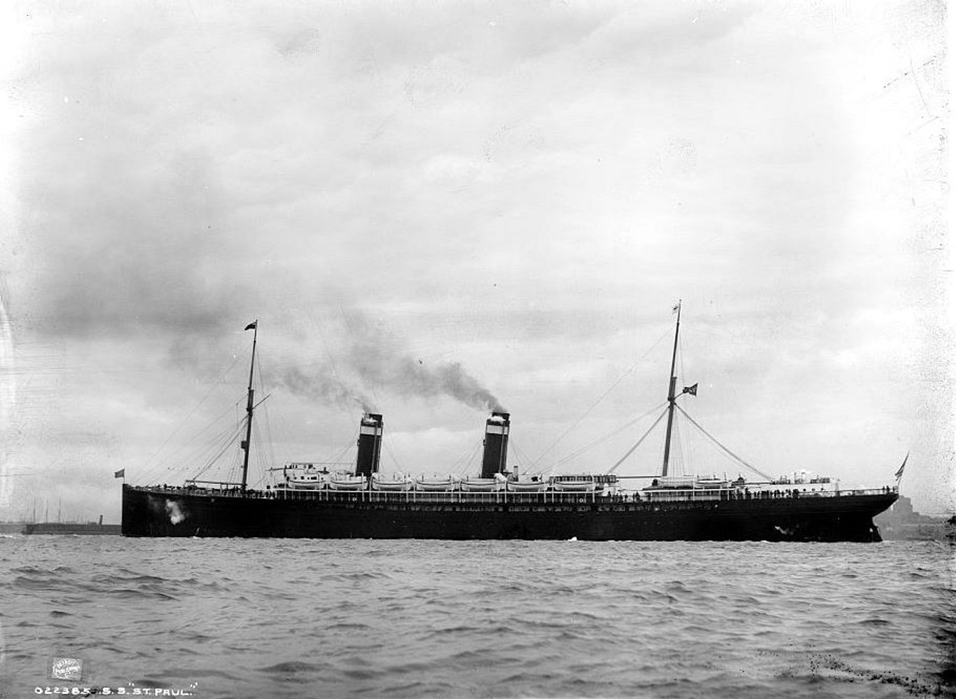 Broadside view of the SS St. Paul in 1895, at an unknown location, shortly after her completion. The ship was commissioned the auxiliary cruiser USS St. Paul on 20 April 1898, for service in the Spanish American War. Library of Congress, LC-D4-22385 |