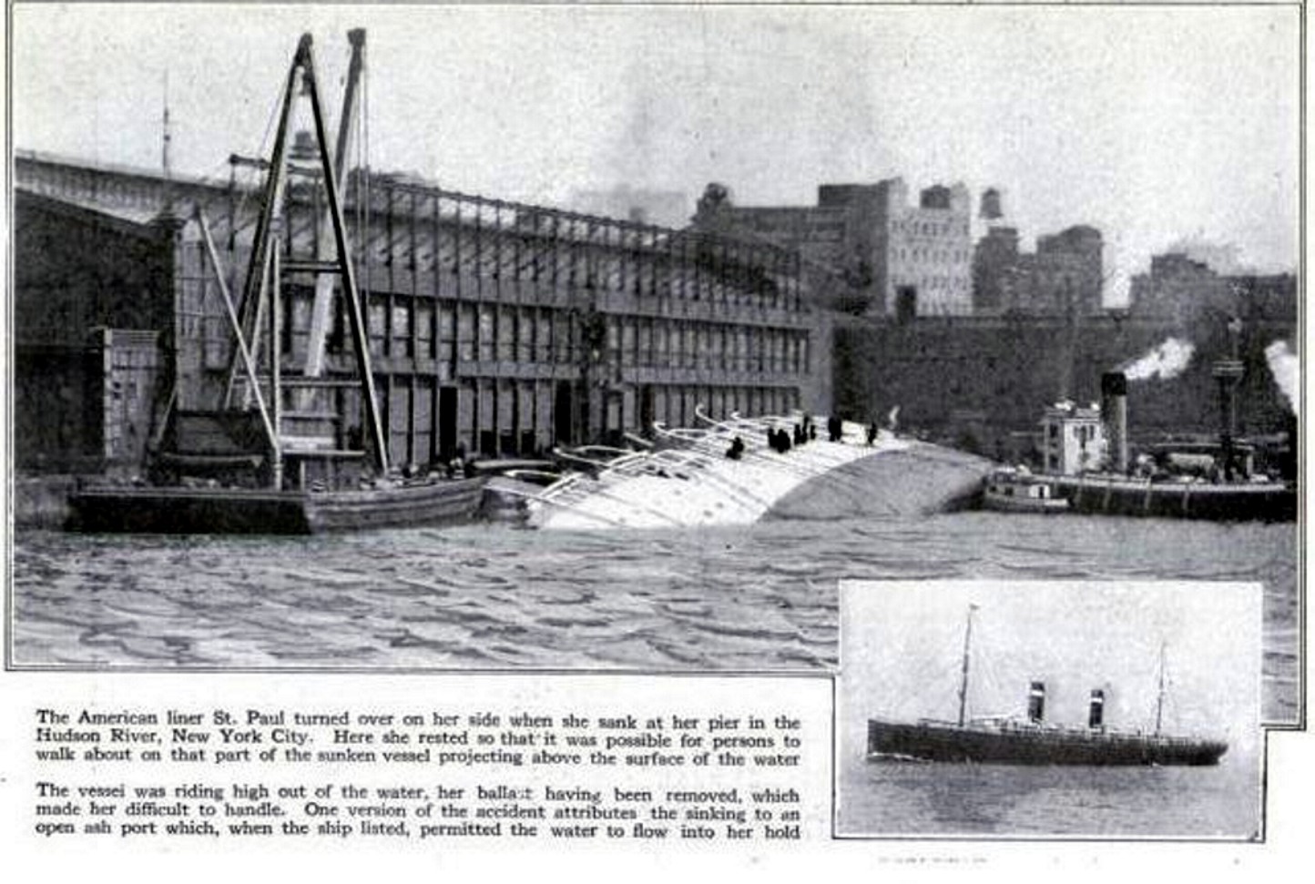 NR | Refloating the St Paul a Salvage Marvel Double Probbm of Righting and Pumping Her Out Made Difficult by Small Space THE ST. PAUL AS SHE LAY at LOW TIDE IMMEDIATELY AFTER SINKING. | Image and text provided by The New York Public Library, Astor, Lenox and Tilden Foundation. Photo from The Sun. [volume] (New York [N.Y.]) 1916-1920, 13 October 1918, Section 4 Magazine Section, Image 35, via chroniclingamerica.loc.gov. | |