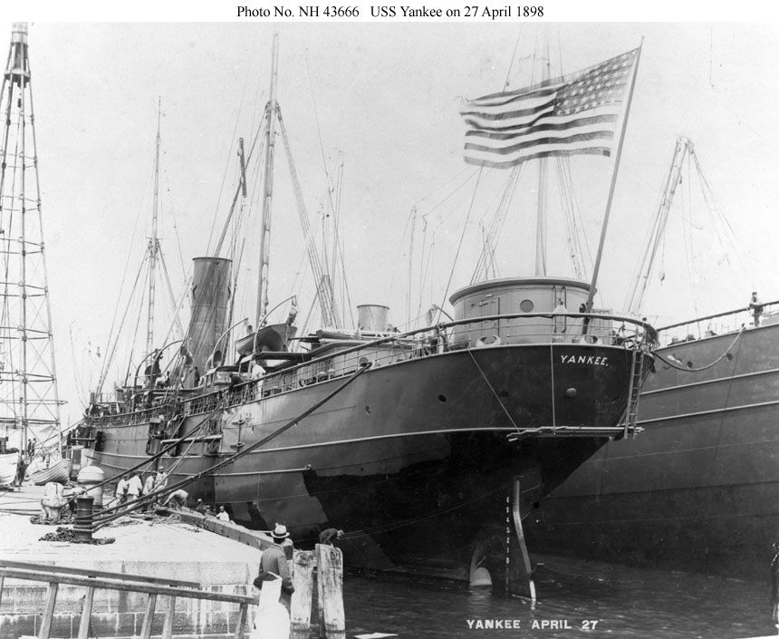 USS Yankee photographed at the New York Navy Yard, 27 April 1898, following conversion to an auxiliary cruiser. Her hull is being repainted from civilian black to wartime Navy gray. Ship outboard of her is probably USS Prairie. U.S. Naval Historical Center Photograph #NH 43666. |