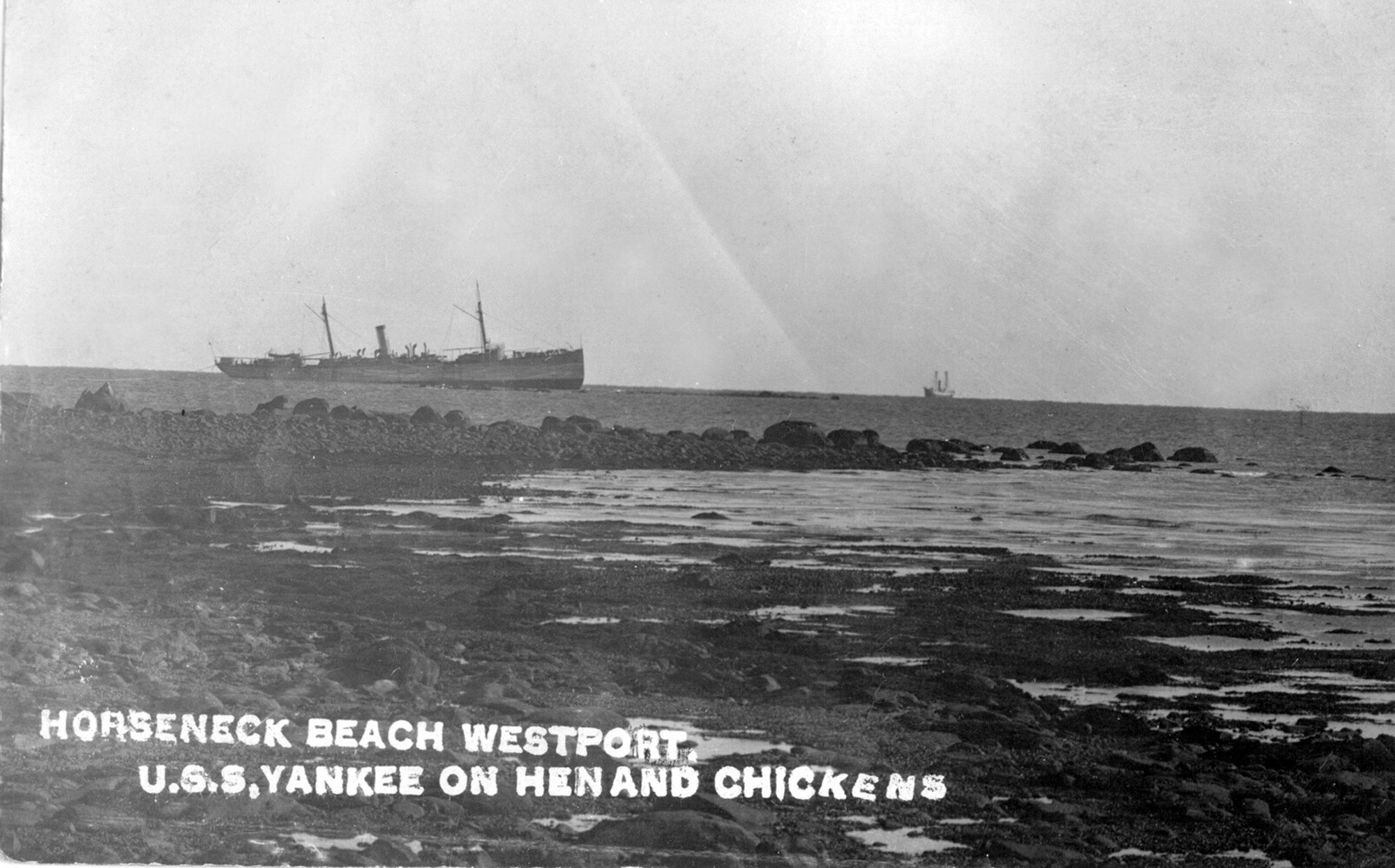 1.05k | U.S.S. YANKEE Aground on Hens and Chickens Reef as seen from Horseneck Beach. | Image and text provided by Westport Historical Society | |