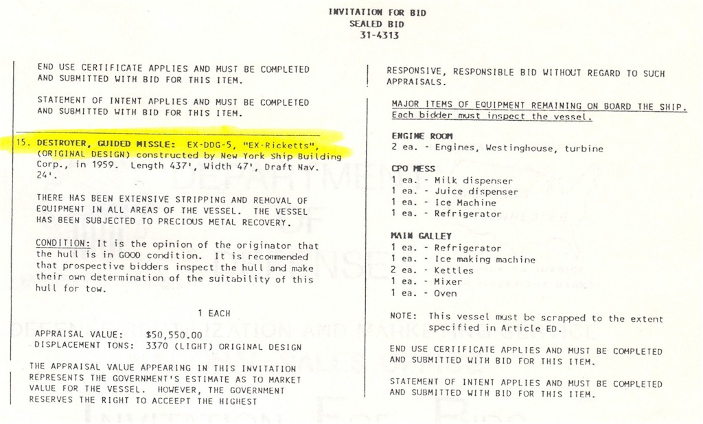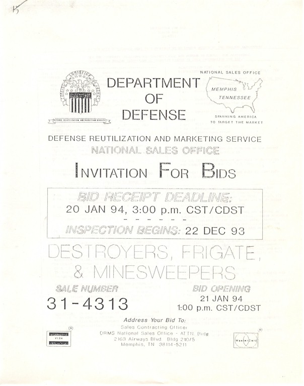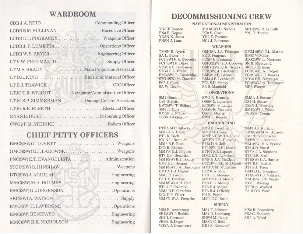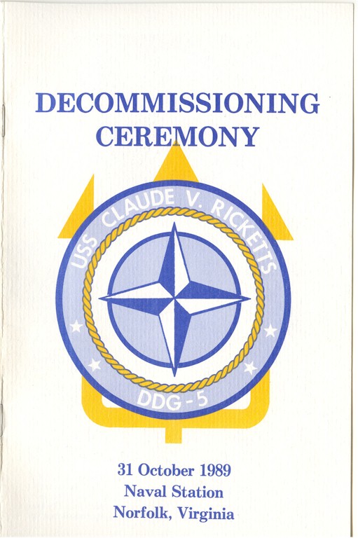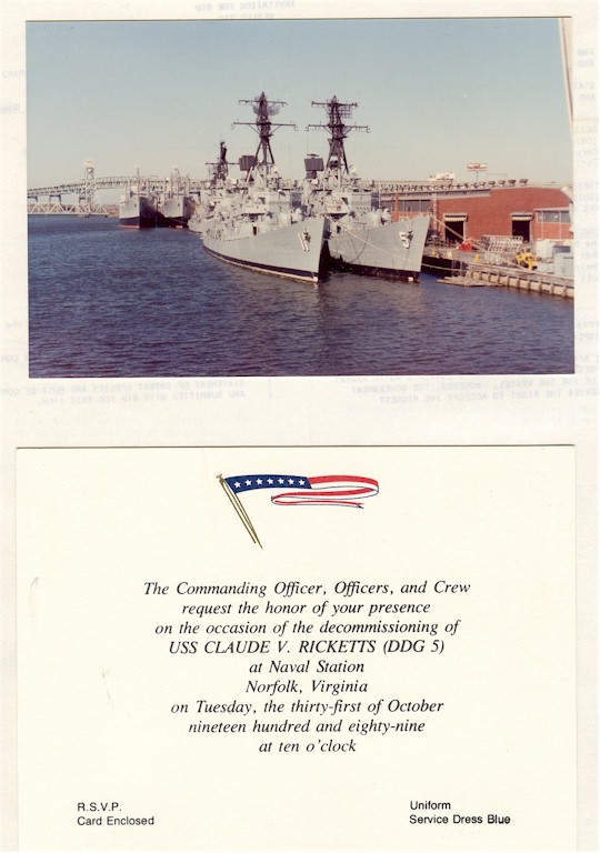 | 92k | Invitation to the Decommissioning Ceremony. Photo taken at NISMF Philadelphia in 1990. The Sellers (DDG-11) is outboard of the Ricketts, and the two merchants in the backround are the S.S. Lake (T-AKR 5016), and S.S. Scan (T-AKR 5017). | Ron Reeves |