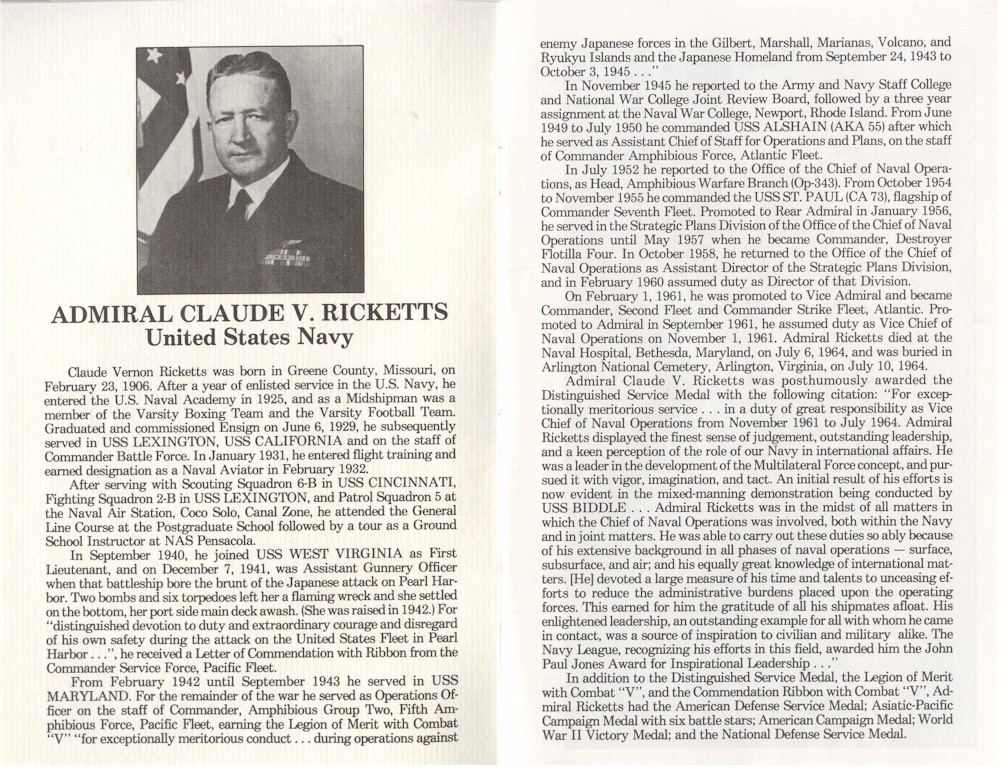 [2] 109k | [1] Born in Philadelphia, Pa., in 1750, Nicholas Biddle was appointed a Captain in the Continental Navy in 1775. He had a brilliant career in command of Andrew Doria and Randolph and was killed when the latter blew up while engaging the far larger HMS Yarmouth, 7 March 1778. [2] Admiral Claude Vernon Ricketts (February 23 1906 - 6 July 1964) served in the United States Navy as the Vice Chief of Naval Operations. Originally enlisted in the Navy, Ricketts attended the United States Naval Academy and became an officer upon his graduation in 1929. As a lieutenant, he was the gunnery officer on board the USS West Virginia (BB-48) during the attack on Pearl Harbor. When West Virginia threatened to capsize after taking several torpedo hits, Ricketts lead a successful effort to initiate counterflooding and stabilize the ship. His quick action is widely credited with preventing West Virginia from sharing the fate of USS Oklahoma. Ricketts commanded USS Saint Paul (CA-73) during 1955. He later became Commander Second Fleet and then assumed duties as the Vice Chief of Naval Operations. The USS Claude V. Ricketts (DDG-5) was named for him as is Ricketts Hall at the Naval Academy. | [1] Bill Gonyo