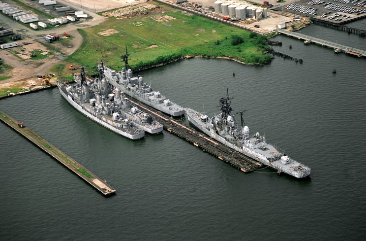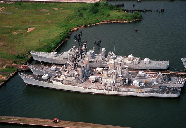| 124k | Baltimore, Maryland Aug 25, 1994: An aerial port side view of two Adams-class guided missile destroyers and one Forrest Sherman-class destroyer tied up at the Baltimore Fairfield Marine Terminal awaiting scrapping. The destroyer on the right unidentified. The inboard guided missile destroyer is the Lawrence (DDG-4) with the Claude V. Ricketts (DDG-5) outboard. The two Forrest Sherman Class destroyers are the USS Bigelow (DD-942) and USS Davis (DD-937). | Gerd Matthes |