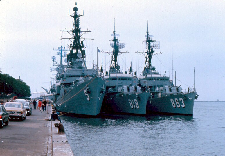 | 105k | USS Claude V. Ricketts (DDG-5), USS New (DD-818) and USS Steinaker (DD-863) in August 1972 at Copenhagen, Denmark with USS Intrepid (CVS-11) berthed behind. | Jim Converse, Ltjg USNR, USS Intrepid (CVS-11) |