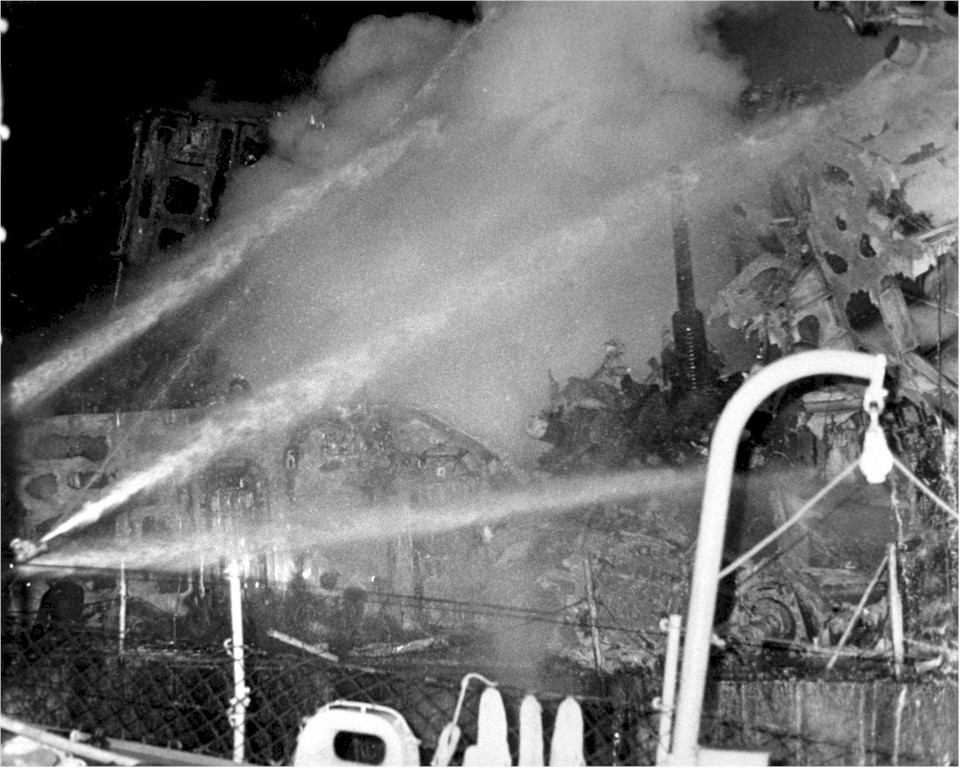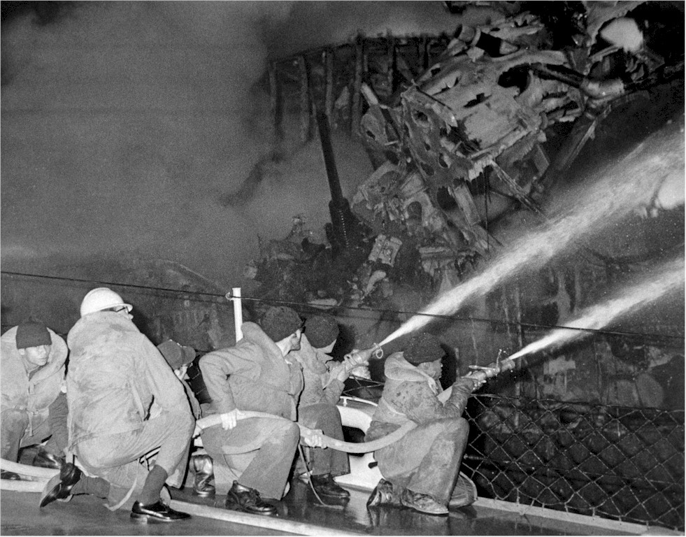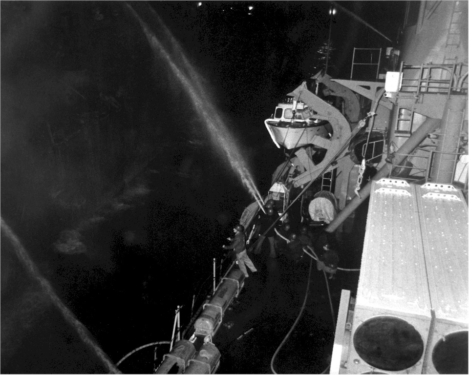 Firefighters aboard the guided missile destroyer USS CLAUDE V. RICKETTS (DDG 5) direct spray from their hoses onto a fire aboard the guided missile cruiser USS BELKNAP (CG 26). The BELKNAP was heavily damaged and caught fire when it collided with the aircraft carrier USS JOHN F. KENNEDY (CV 67) during night operations on November 22 1975. | Fabio Peña |