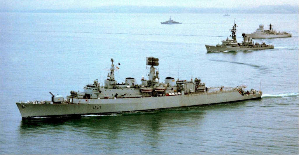 | 129k | Aerial port view of ships from the Standing Naval Force, Atlantic, underway in formation on 1 July 1982. The ships are, from front to back : HMS Norfolk (D21); USS Claude V. Ricketts (DDG-5); HNLMS De Ruyter (F806) and FGS Braunschweig (F225). U.S.National Archive. Photo # NN33300514. | Robert Hurst |