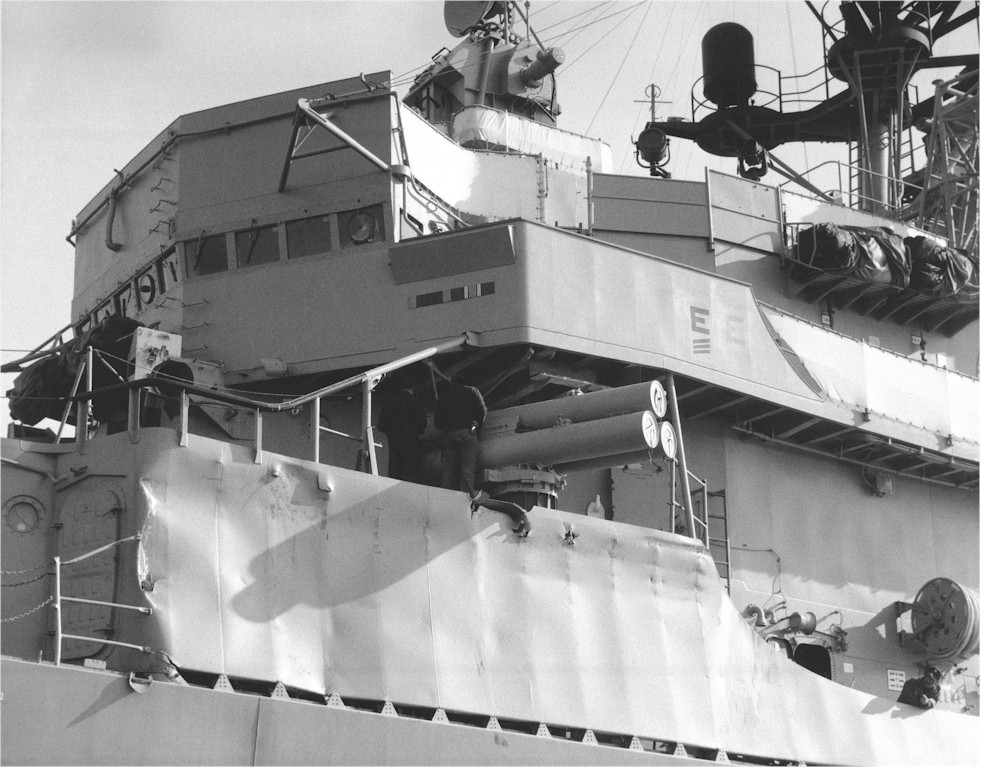 A view of damage sustained by the guided missile destroyer USS CLAUDE V. RICKETTS (DDG 5) while fighting a fire aboard the guided missile cruiser USS BELKNAP (CG 26). The BELKNAP was heavily damaged and caught fire when it collided with the aircraft carrier USS JOHN F. KENNEDY (CV 67)during night operations on November 22 1975. | Fabio Peña |