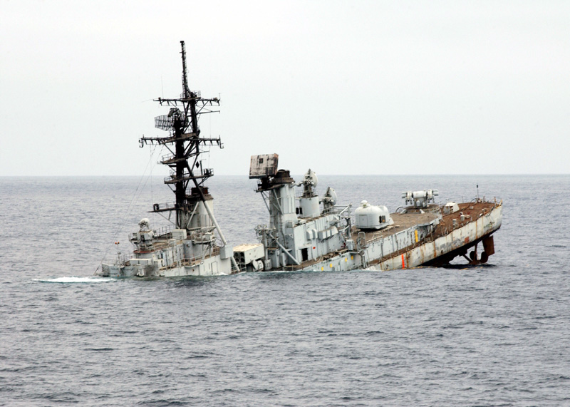 | 158k | Pacific Ocean (October 9, 2002), the decommissioned ship Towers (DDG 9), an old Adams-class destroyer, slowly sinks in the Pacific Ocean after being used as a target hulk for live-fire sinking exercises (SINKEX). Using decommissioned ships for live-fire operations gives ships' crews the experience of launching operational weapons and honing their war-fighting skills. The decommissioned ships are first made environmentally safe prior to towing and sinking in safe waters off prospective coastlines. Ultimately, the Towers will serve as a man-made reef for marine life in the area. U.S. Navy photo by Photographer's Mate Airman Andrew Betting. (021009-N-8590B-005) | Fabio Peña |