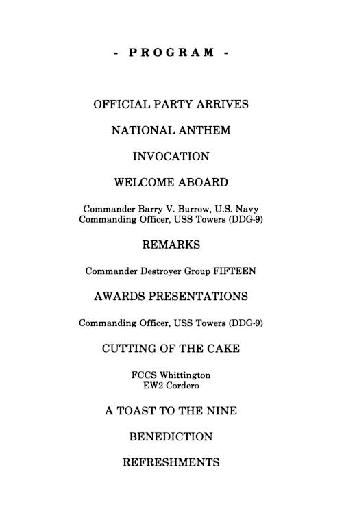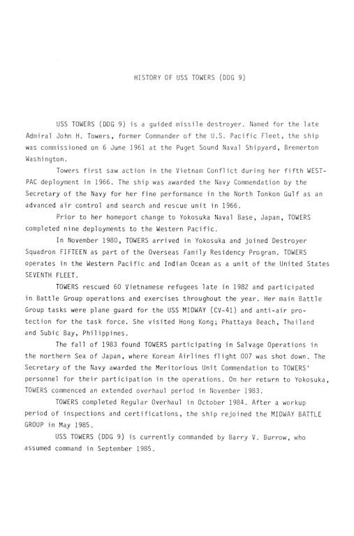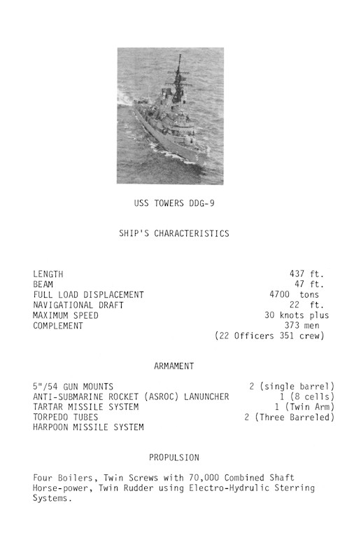 | 83k | USS Towers (DDG-9), underway off the coast of southern California, 16 January 1976. Photograph by PH1(AC) A.E. Legare, USN, Ships History Branch, USS Towers (DDG-9) File. | Robert Hurst |