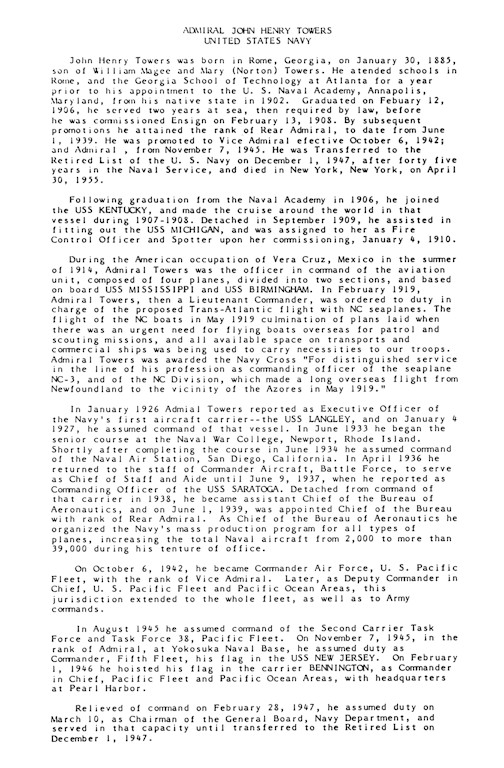 A native of Rome, Georgia, Towers was graduated by the United States Naval Academy in 1906 and then went to sea, serving with distinction aboard the battleship Kentucky. He became interested in aviation and after numerous requests for aviation duty he was finally granted his wish and assigned to the Curtiss Flying School on June 27, 1911. There he became the Navy's third aviator following Theodore Gordon Ellyson and John Rodgers. He learned to fly the Navy's first airplane, a Curtiss seaplane called the A-1. It was soon afterward that he and Ellyson made a record distance flight down the Chesapeake Bay from Annapolis to Old Point Comfort, Virginia, in the A-1. Later, he took over the training of the other young Navy pilots. One of the highlights of 1912 occurred in October when he rigged extra gasoline tanks to a Curtiss seaplane for an endurance flight. Taking off from the Severn River at Annapolis early in the morning, he climbed up over the Chesapeake Bay and remained aloft over 6 hours, setting a world's endurance record the first official record flight made by a Naval pilot. Early in December he completed tests which demonstrated the ability to spot submarines from the air, even in the muddy waters of the Chesapeake Bay. In 1913 he was in charge of the aviation unit which began its first operations with the Fleet off Guantanamo Bay, Cuba. He and his follow Navy pilots explored all the potential of their planes to serve the Navy aerial reconnaissance, bombing, aerial photography, and wireless communications. In the ocean waters off Cuba they were able to spot submarines at depths of 30 to 40 feet. One day in June, 1913, he was a passenger in the Wright seaplane being piloted by Ensign William Billingsley. Suddenly, 1,600 feet above Chesapeake Bay, they hit severe turbulence. Without warnings Billingsley was hurled out of the seat and fell to his death on the water far below. The first Navy pilot to make the supreme sacrifice. Unbelievably, Towers managed to catch and cling to a wing strut and ride the plummeting unpiloted plane down, miraculously surviving the crash. After that incident, he ordered safety belts for all the Navy planes. In January 1914 he set up the first training Naval Air Station in an abandoned Navy yard at Pensacola, Florida. It was from here that he led his unit in the first Naval air operations during the Mexican crisis. It was after World War I that he participated in one of the greatest exploits in aviation history. It was in 1919 that he led the Navy's attempted trans-Atlantic flight of Curtiss NC flying boats. All four planes were ready in April for the departure from Rockaway Naval Air Station, but a severe storm scratched the NC-2 from the flight. When they took off on May 8th on the historic flight, he was in command of the flight and of the Flagship W-3. Patrick Bellinger commanded the NC-1 and Albert C. Read the NC-4. The first leg of the flight was to Halifax, but the NC-4, suffering severe engine troubles was forced to land at sea. The NC-1 and NC-3 proceeded from Halifax on to Trepassay, New Foundland, and awaited there until the NC-4 arrived after being repaired. On May 16 all three planes were ready and took off from Trepassey's harbor. Out over the sea, the planes climbed to 1,000 feet an occasional iceberg glinted in the light of the setting sun. It was planned to fly in formation but both his NC-3 and Bellinger's NC-1 fell behind Read's NC-4 as night fell. By early morning they encountered heavy weather. Churning through rain squalls and fog, his NC-3 became hopelessly lost and he had to set her down on the storm-tossed ocean. Unable to take off again because of buckled wing struts, he turned to his experience as a seaman. Rigging a canvas bucket for a sea anchors he used the plane's rudder to drift sail toward Sao Miguel Island, 200 miles away. It was an almost impossible task for an experienced seaman with a reliable ship, but fifty-two grueling hours later he and his crew triumphantly taxied their battered ship into harbor in the Azores an the crowd lining the shore went wild with their joy-ous welcome. Nine days later the NC-4 flew on to Lisbon to complete the historic first trans-Atlantic flight. It was a triumph of planning and skillful flying by the Naval aviators. But perhaps his greatest contribution was his vision in 1921, when he began training of Navy pilots in land planes, in his anticipation of the requirements of the Navy's aircraft carriers yet to come. In 1922 the Navy converted a Collier into the Langley, the first aircraft carriers and the practical problems of operating aircraft from it were gradually solved. Arresting gear and barricades were developed to provide safety in landings. The carriers Lexington and Saratoga were also authorized and these three ships eventually became the nucleus of our pre-war carrier fleet. He served as Executive Officer and later Commander of the Langley and also later of the Saratoga. Finally, in June, 1939, he became Chief of the Bureau of Aeronautics, with the rank of Admiral, becoming the first pioneer Naval aviator to achieve flag rank, and was responsible for expanding Naval aviation in these days of ever-changing criteria. When the Japanese struck Pearl Harbor, Naval aviation was just 30 years old and the Navy faced the greatest task in its history for many of its warships and airplanes lay in the mud of Pearl Harbor. But dedicated pioneer Naval aviators such as he were the Navy's greatest asset, for they had lived and breathed flying ever since our first carriers were launched. They were able to pass their lessons on to the thousands of Naval aviators to be trained. He directed Naval aviation's expansion during World War II and helped develop the strategy for winning the war in the Pacific. By 1943 a tremendous change was wrought in the Pacific as the "Flat-Top" became "Queen" of the fleet and its aircraft led the fleet toward victory an the world's greatest sea-borne Air Force. At the e