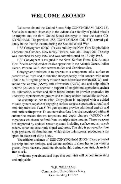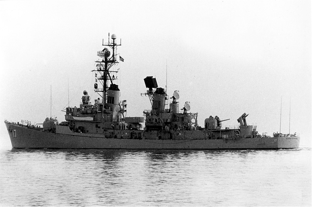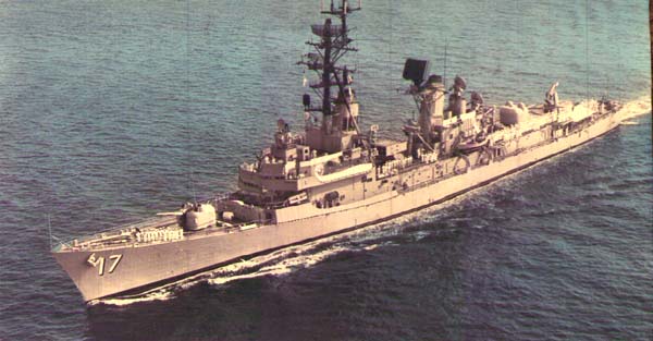 | 103k | DN-ST-85-05409. A starboard quarter view of the guided missile destroyer USS CONYNGHAM (DDG 17) as seen from an approaching utility boat off the coast of El Salvador. Photo by PH1 Jeff Hilton, August 1 1984. | Bill Gonyo |