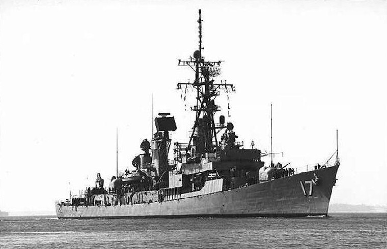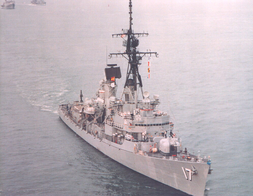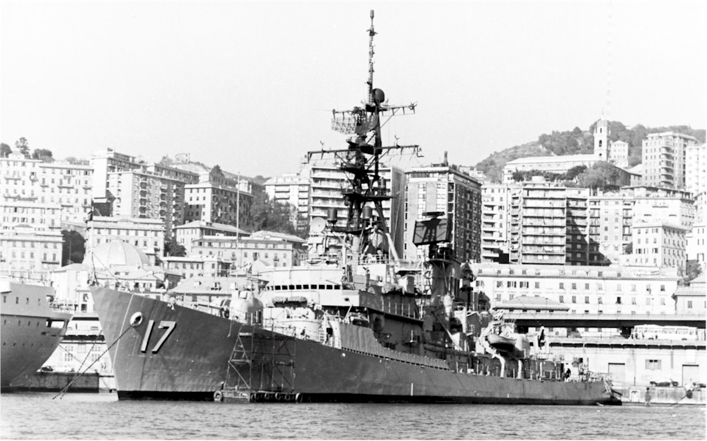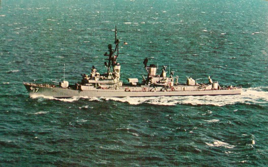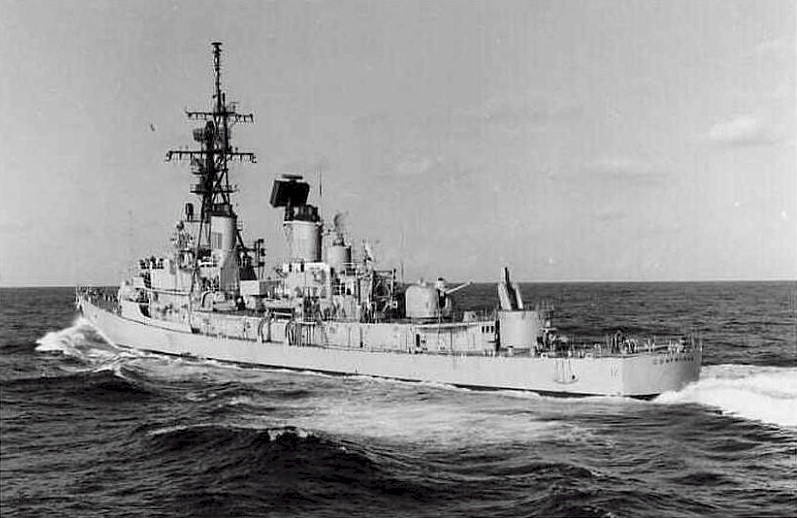 | 55k | At Barcelona, Spain, in the summer of 1973. From left to right: the guided missile destroyer leader/frigate (later cruiser) USS Dale (DLG 19, later CG 19); the guided missile destroyers USS Conyngham (DDG 17) and USS Richard E. Byrd (DDG 23), the destroyer escort (later frigate) USS Elmer Montgomery (DE 1082, later FF 1082), and the destroyers USS Glennon (DD 840) and USS Sarsfield (DD 837). Photo by Isidoro Cenera. | Fabio Peña |