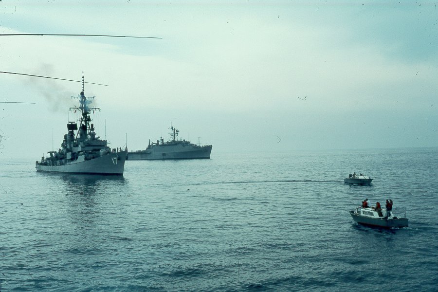 | 197k | June 25 1976. Eastern part of the Mediterranean Sea, Kithira Strait. USS Conyngham lies at anchor with Amphibious Group near the Soviet Kashin class DDG Krasny Krim. The USS Barnstable County (LST-1197) is background. | Eugene Ivkin |