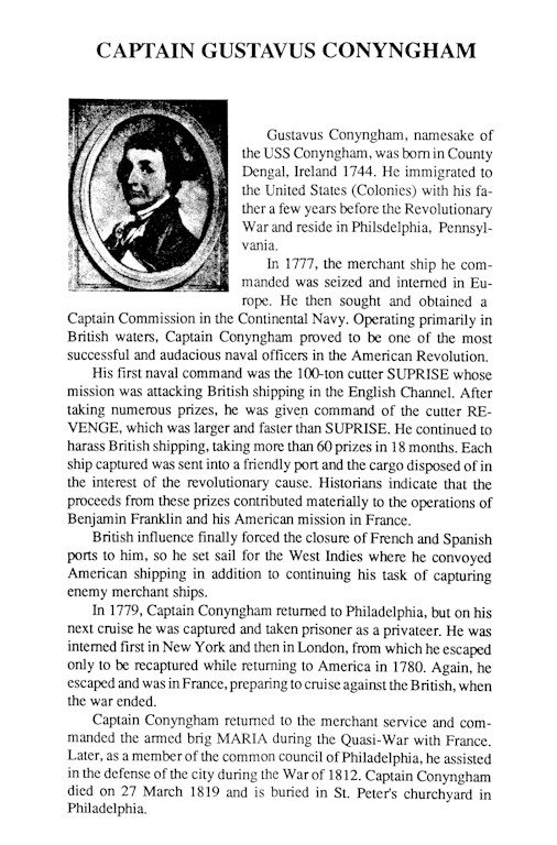 73k | Born about 1744 in County Donegal, Ireland, Gustavus Conyngham commanded the merchant brig Charming Peggy in 1775. When his ship was interned in Europe, Conyngham sought and on 1 March 1777 obtained a captain's commission in the Continental Navy. As commanding officer, successively, of Surprise, and Revenge, he became a terror to British shipping, taking some 60 prizes in 18 months. As a privateer he was captured in 1779, escaped to Europe, and was recaptured while returning to America in 1780. Exchanged a year later, he was in France preparing to cruise against the British when the war ended. He returned to the merchant service and commanded the armed brig Maria during the Quasi-War with France. As a member of the Common Council of Philadelphia, he assisted in the defense of that city during the War of 1812. Captain Conyngham died 27 November 1819 at Philadelphia, Pa. the Quasi-War with France. As a member of the Common Council of Philadelphia, he assisted in the defense of that city during the War of 1812. Captain Conyngham died 27 November 1819 at Philadelphia, Pa. Photo #: NH 84902-KN. Captain Gustavus Conyngham, Continental Navy painting by V. Zveg, 1976, based on a miniature by Louis Marie Sicardi. Courtesy of the U.S. Navy Art Collection, Washington, D.C. U.S. Naval Historical Center Photograph. | Tony Cowart/Robert M. Cieri |