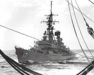 | 24k | USS Harry E. Yarnell DLG-17 (L) and USS Conyngham DDG-17 (R) in the Mediterranean during 1965, coming alongside the USS Chikaskia for refueling. From the collections of RADM Edward L. Feightner, BM2 Charles Peterman, and LCDR Al Gordon as compiled and edited by BM3 David Zanzinger. | LCDR Al Gordon USN (Ret.) |