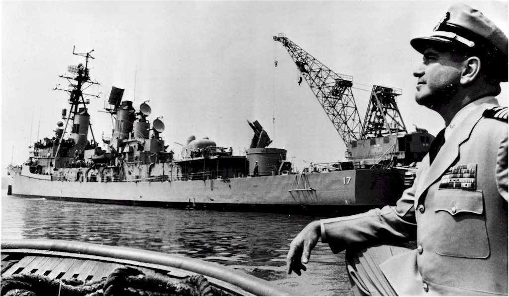 | 166k | Philadelphia Naval Base, June 12 1963, CDR. Edwin Paul Smith, Jr., who will take command of the Navy’s newest guided missile destroyer Conyngham when she’s commissioned tomorrow at the Philadelphia Naval Base, looks over the sleek destroyer today. Commander Smith, a native of Huntington, W.V., will captain the vessel that is the sixth in the series type commissioned here. She is armed with surface-to-air Tartar guided missile system, Asroc ASW (Anti-Submarine Warfare) rockets, and Mk 32 ASW Torpedo Tubes. | Bill Gonyo |