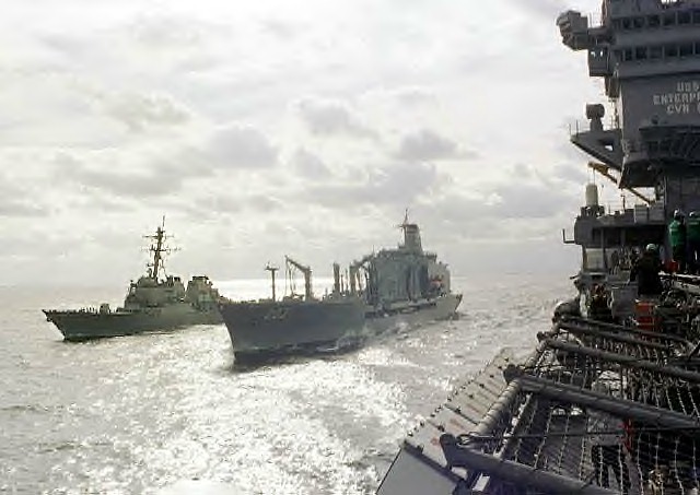 | 69k | The aircraft carrier USS Enterprise (CVN 65) and the guided missile destroyer USS Gonzalez (DDG 66) conduct an emergency break away drill during underway replenishment operations off the coast of Virginia with the Military Sealift Command oiler USNS Laramie (T-AO 203), Nov. 8, 1998. Enterprise is currently on a scheduled six-month deployment to the Arabian Gulf in support of Operation Southern Watch. U.S. Navy photo by Photographer's Mate Airman Apprentice William R. Crossly. [981108-N-0063C-001] Nov. 8, 1998. | Fred Weiss |