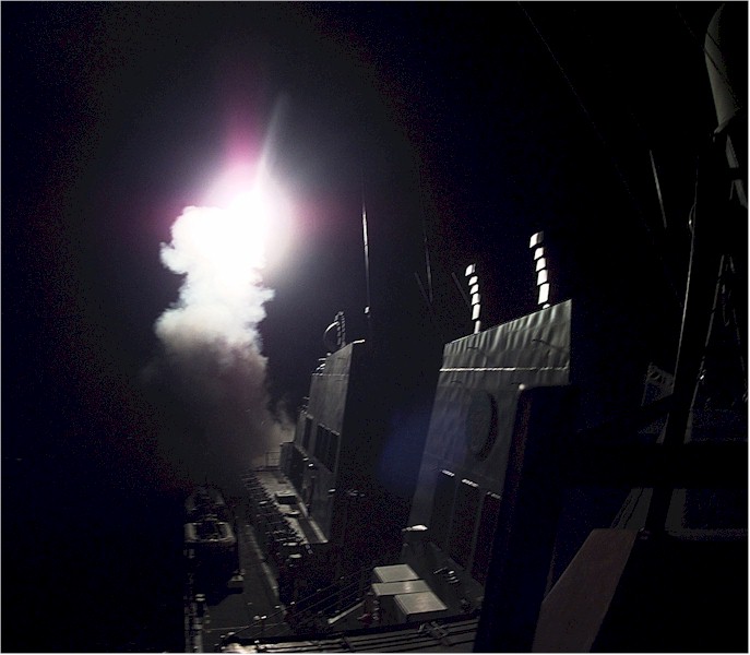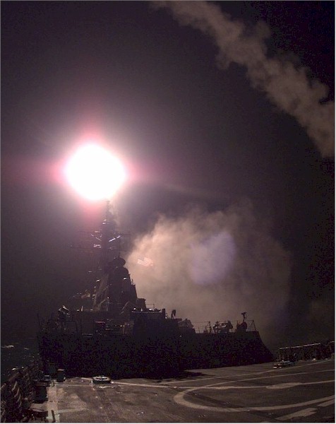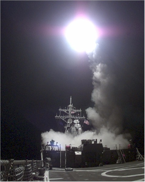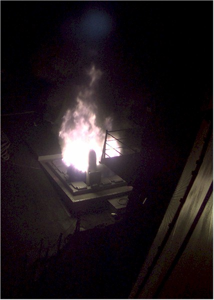 | 56k | Aboard USS Gonzalez (DDG 66) Apr. 3, 1999, in the early morning hours somewhere in the Adriatic Sea, a "Tomahawk" cruise missile launches from the forward missile deck aboard the U.S. Navy destroyer USS Gonzalez, headed for targets in Yugoslavia. Navy Photo by Photographers Mate 3rd Class Renso Amariz. | Fred Weiss |