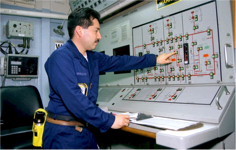 | 117k | 990501-N-5906L-004. At sea aboard USS Gonzalez (DDG 66), May 1 1999, Fireman Jose Oregon from Houston, TX, closes a section of the ship firemain from the main control board on board the USS Gonzalez. Gonzalez is in the Adriatic Sea in support of Operation Allied Force. U.S. Navy photo by Photographer’s Mate 3rd Class Todd Linard. | Bill Gonyo |