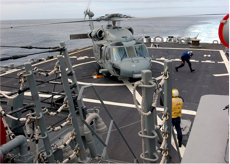 | 146k | 050404-N-3557N-080. Atlantic Ocean, April 4 2005, a Sailor assigned to the Air Department moves to a safe location after chocking the wheels of an MH-60S Seahawk helicopter aboard the guided missile destroyer USS Gonzalez (DDG 66). Gonzalez, assigned to the USS Kearsarge (LHD 3) Expeditionary Strike Group, is on a regularly scheduled deployment in support of the Global War on Terrorism. U.S. Navy photo by Photographer's Mate Airman Christopher J. Newsome. | Bill Gonyo |