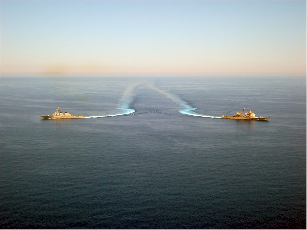 | 127k | 080518-N-3202K-001. Mediterranean Sea, May 18 2008, the guided-missile cruiser USS Hue City (CG 66) and the guided-missile destroyer USS Gonzalez (DDG 66) meet in the eastern Mediterranean Sea. Hue City is returning to homeport from a six-month deployment to the Persian Gulf and Gonzalez is on a scheduled six-month deployment to the U.S. 6th Fleet area of responsibility. U.S. Navy photo. | Robert M. Cieri |