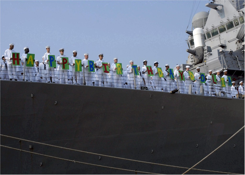 | 143k | 080818-N-2838W-142. Norfolk, Va., August 18 2008, sailors assigned to the guided missile destroyer USS Gonzalez (DDG 66) man the rails while wishing a happy birthday to Dolia Gonzalez, the mother of Marine Corps Sgt. Alfredo Gonzalez, the vessel's namesake. Gonzalez returned from a six-month deployment serving as the Air Defense Commander for Standing NATO Maritime Group Two. U.S. Navy photo by Mass Communication Specialist 3rd Class David Wyscaver. | Robert M. Cieri |