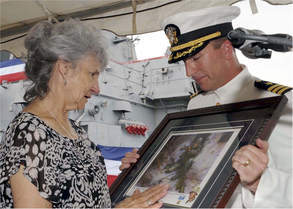 | 212k | U.S. Navy Cmdr. Brian Fort, right, commanding officer of the guided missile destroyer USS Gonzalez (DDG 66), presents Dolia Gonzalez with a painting of her son, Medal of Honor recipient and namesake of the ship U.S. Marine Corps Sgt. Alfredo Gonzalez, before turning command of the ship over to Cmdr. Lynn Acheson at Naval Station Norfolk, Va., Aug. 14, 2009. The crew of Gonzalez commissioned the painting as a gift for Dolia Gonzalez in honor of her upcoming 80th birthday. U.S. Navy photo by Mass Communication Specialist 1st Class Michelle Lucht. 090814-N-2645L-065. | Bill Gonyo |