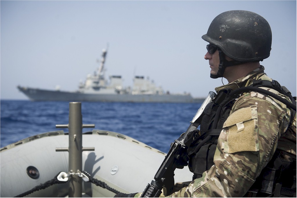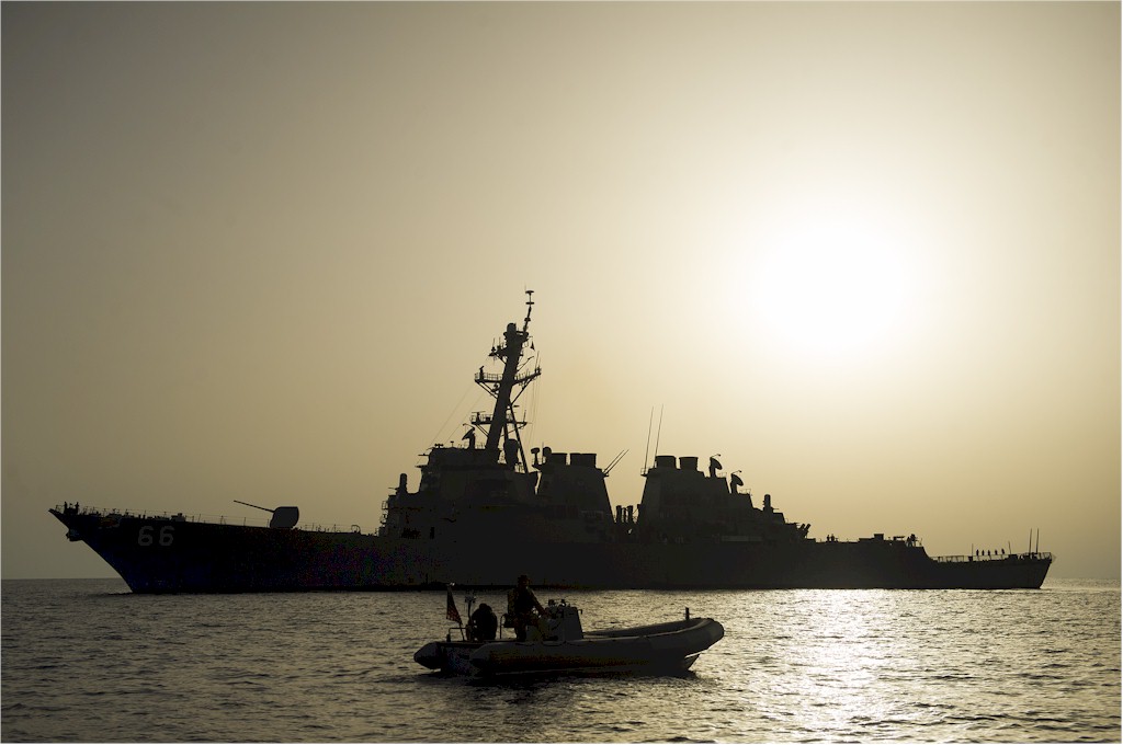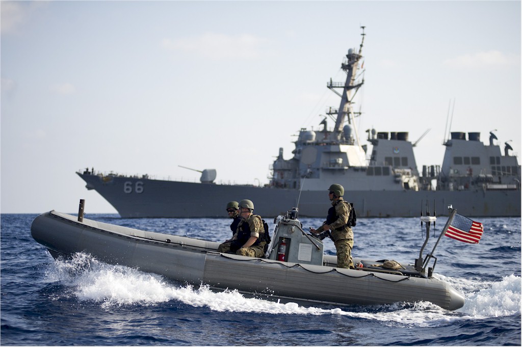 | 116k | 160522-N-VE959-109. Gulf of Aden, May 22 2016, a member of the visit, board, search and seizure team rides in a rigid-hull inflatable boat alongside guided-missile destroyer USS Gonzalez (DDG 66). Gonzalez is currently operating with the Boxer Amphibious Ready Group in support of maritime security operations and theater security cooperation efforts in the U.S. 5th Fleet area of operations. U.S. Navy photo by Mass Communication Specialist 3rd Class Pasquale Sena. | Ron Reeves |