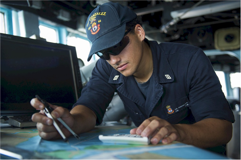 | 131k | 160508-N-VE959-020. Gulf of Aden, May 8 2016, Quartermaster Seaman Jeremy Guadalupe plots a track in the pilothouse of guided-missile destroyer USS Gonzalez (DDG 66). Gonzalez is currently operating with the Boxer Amphibious Ready Group in support of maritime security operations and theater security cooperation efforts in the U.S. 5th Fleet area of operations. U.S. Navy photo by Mass Communication Specialist 3rd Class Pasquale Sena. | Ron Reeves |