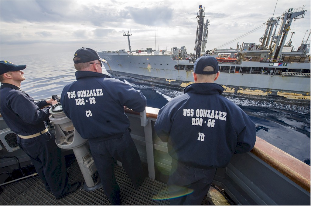 | 175k | 160111-N-VE959-204. Mediterranean Sea. January 11 2016, Cmdr. Stefan Walch, commanding officer, guided-missile destroyer USS Gonzalez (DDG 66), and Cmdr. Les Sobol, executive officer, oversee a replenishment-at-sea with fleet replenishment oiler USNS Leroy Grumman (T-AO 195). Gonzalez is deployed as part of the Harry S. Truman Carrier Strike Group, conducting naval operations in the U.S. 5th and 6th Fleet areas of operations in support of U.S. national security interests in Europe and Africa. U.S. Navy photo by Mass Communication Specialist 3rd Class Pasquale Sena. | Ron Reeves |