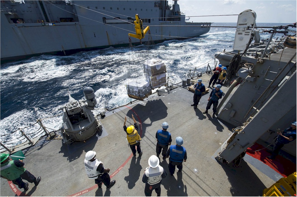 | 252k | 160121-N-VE959-238. Indian Ocean, January 21 2016, sailors guide cargo aboard the guided-missile destroyer USS Gonzalez (DDG 66) during a replenishment-at-sea with the Military Sealift Command fleet replenishment oiler USNS Richard E. Byrd (T-AKE 4). Gonzalez is deployed as part of the Harry S. Truman Carrier Strike Group, supporting maritime security operations and theater security cooperation efforts in the U.S. 5th Fleet area of operations. U.S. Navy photo by Mass Communication Specialist 3rd Class Pasquale Sena. | Ron Reeves |