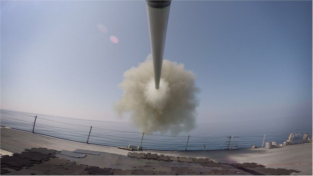 | 54k | 990404-N-1556A-002. 4 April 1999, Adriatic Sea, in a split second flash of fire and smoke, a "Tomahawk" cruise missile starts its launch from the forward Vertical Launch System (VLS) missile deck of the USS Gonzalez (DDG 66). GONZALEZ is currently forward deployed in the Adriatic Sea to support NATO Operation Allied Force. U.S. Navy Photo by PH3 Renso Amariz. | Robert M. Cieri |