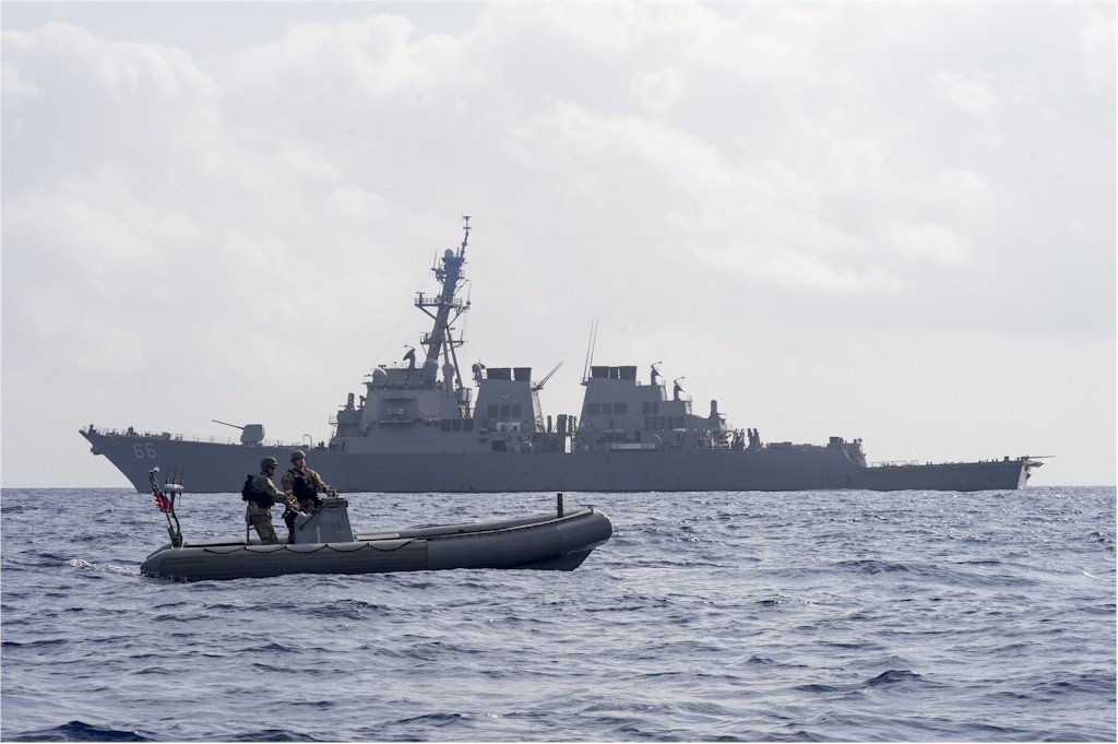 | 143k | 160501-N-VE959-023. Gulf of Aden, May 1 2016, members of the visit, board, search and seizure (VBSS) team operate a rigid-hull inflatable boat (RHIB) alongside guided-missile destroyer USS Gonzalez (DDG 66). Gonzalez, deployed as part of the Harry S. Truman Carrier Strike Group, is currently operating with the Boxer Amphibious Ready Group in support of maritime security operations and theater security cooperation efforts in the U.S. 5th Fleet area of operations. U.S. Navy photo by Mass Communication Specialist 3rd Class Pasquale Sena. | Ron Reeves |