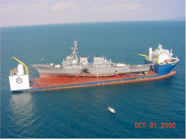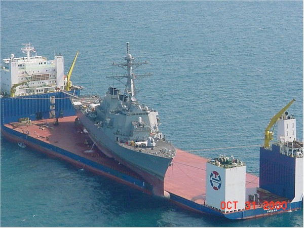 | 208k | 001031-M-5978M-005. Aden, Yemen, October 31 2000, USS Cole (DDG 67) lifted aboard the MV Blue Marlin, a Norwegian dry dock vessel. The COLE was bombed by terrorists in port on 12 October. The Blue Marlin is transporting the damaged destoyer to the Litton-Ingalls Shipyard at Pascacoula, Miss. USMC photo by Sgt. M.C. Miller. | Robert M. Cieri |