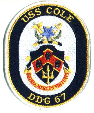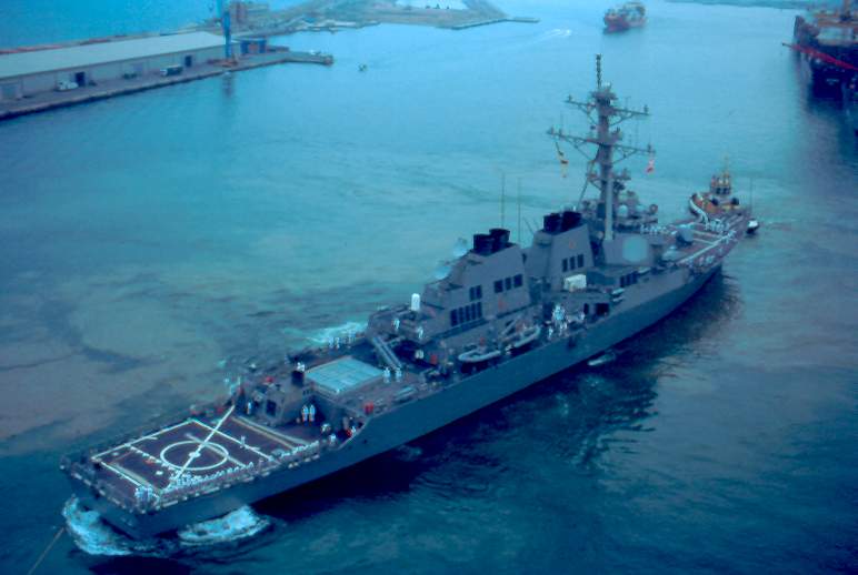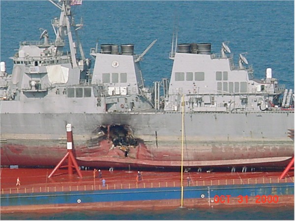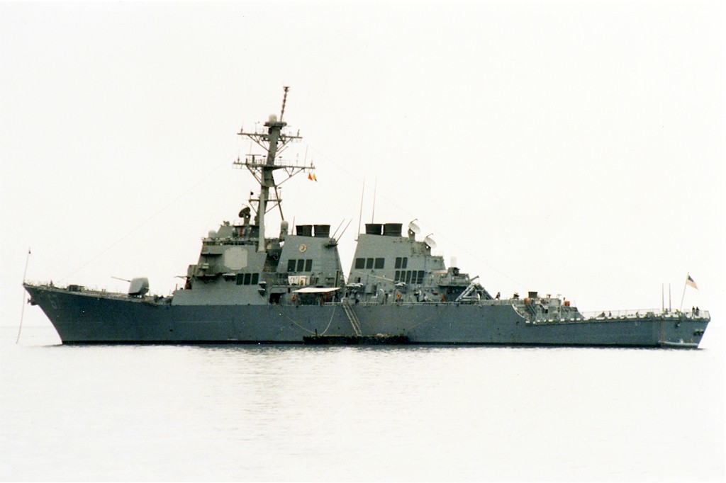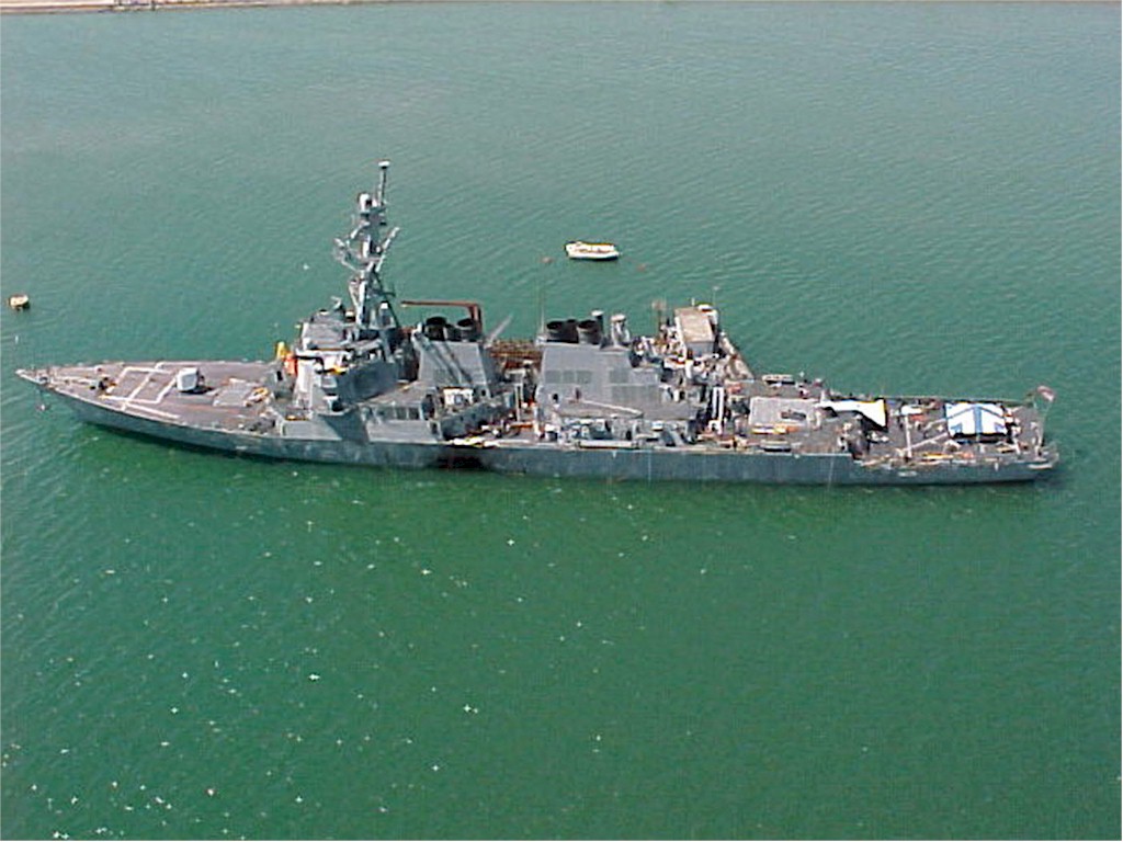 | 153k | 001015-N-0000X-001. Port of Aden, Yemen, October 13 2000, a high angle port beam view of the Arleigh Burke-class guided-missile destroyer USS Cole (DDG 67) moored to a refueling platform in the Port of Aden, Yemen. The hole located amidships was caused by a terrorist attack yesterday, which killed seventeen sailors and injured another thirty nine on board. U.S. Navy photo. | Robert M. Cieri |