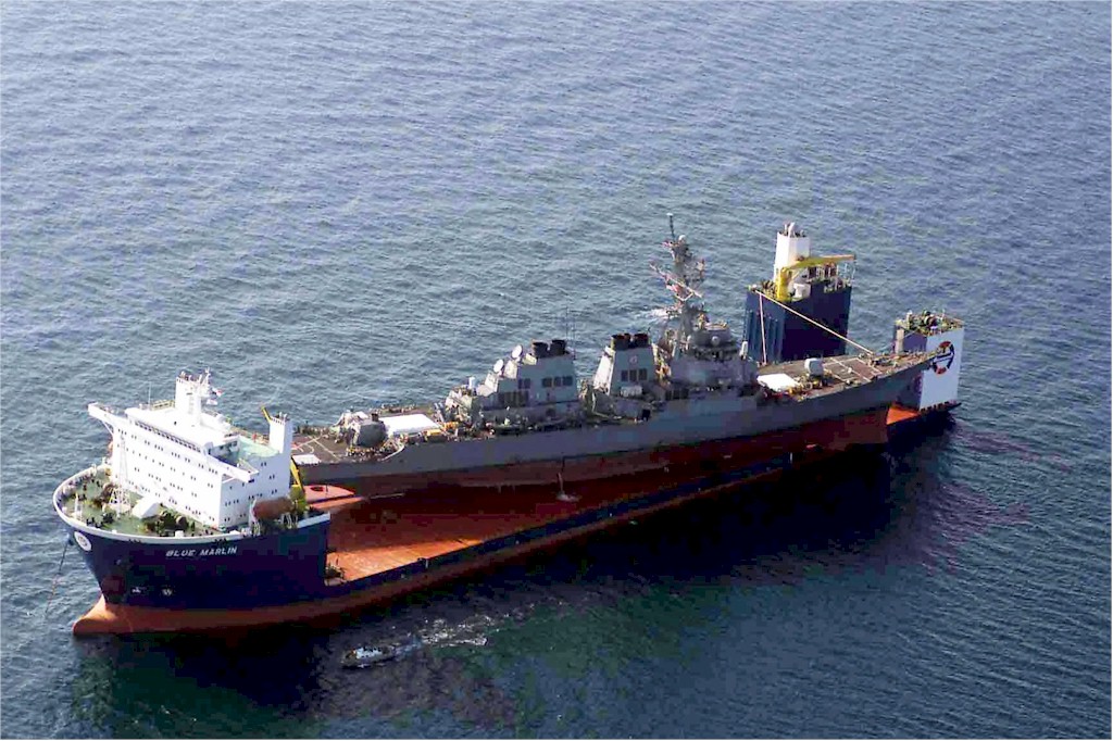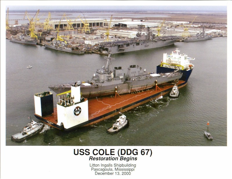 | 86k | The USS Cole (DDG 67) arrives at the Ingalls Shipyard in Pascagoula, Mississippi, aboard the Norwegian commercial lift ship MV Blue Marlin. The Arleigh Burke class destroyer was the target of a terrorist attack in the port of Aden, Yemen, on Oct. 12, 2000, during a scheduled refueling. The attack killed 17 crew members and injured 39 others. | Tommy Trampp |