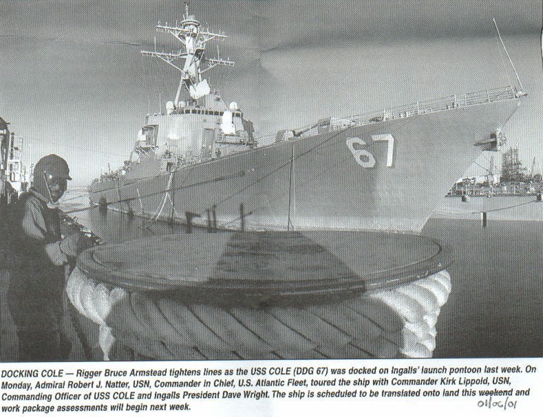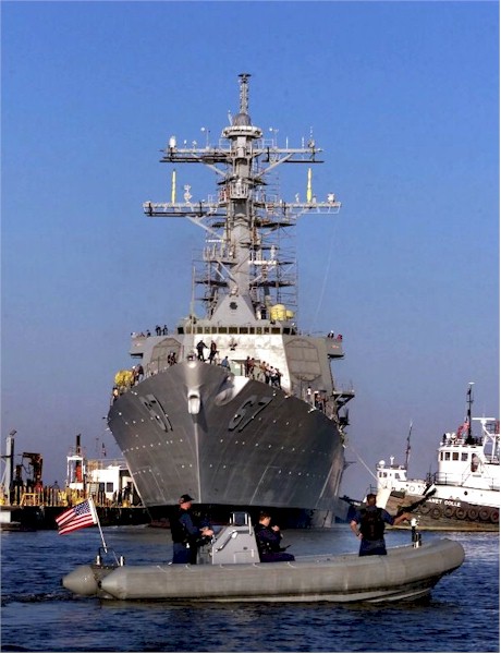 | 91k | Pascagoula, Miss., Dec 24 2000, two tug boats gently push USS Cole (DDG 67) to Pier 4 of the Ingalls Shipyard in Pascagoula, Miss., on Dec. 24, 2000. The Arleigh Burke-class destroyer was the target of a terrorist attack in Aden, Yemen, on Oct. 12, during a scheduled refueling. The attack killed 17 crew members and injured 39 others. U.S. Navy photo. | Fred Weiss |