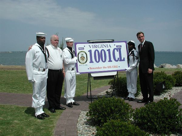 | 60k | Naval Station Norfolk, VA. May 7, 2002 Virginia Gov. Mark Warner, (Far Right) stands with members of the Navy Region Mid-Atlantic Honor Guard and Mr. Jon Clodfelter, second from left, father of hull Maintenance Technician 2nd Class Kenneth Clodfelter, one of the Seventeen sailors killed aboard the Guided Missile Destroyer USS Cole DDG-67 on October 12, 2000. while refueling in the Port city of Aden, Yemen. Gov. Warner visited the installation to sign a bill authorizing the production and sale of a Commemorative license plate honoring those who lost their lives during the attack on the Cole. The plates will be available through the Virginia Department of Motor Vehicles this year. US Navy Photo by Journalist 3rd Class Dani Letina. | Steven A. Cardali |