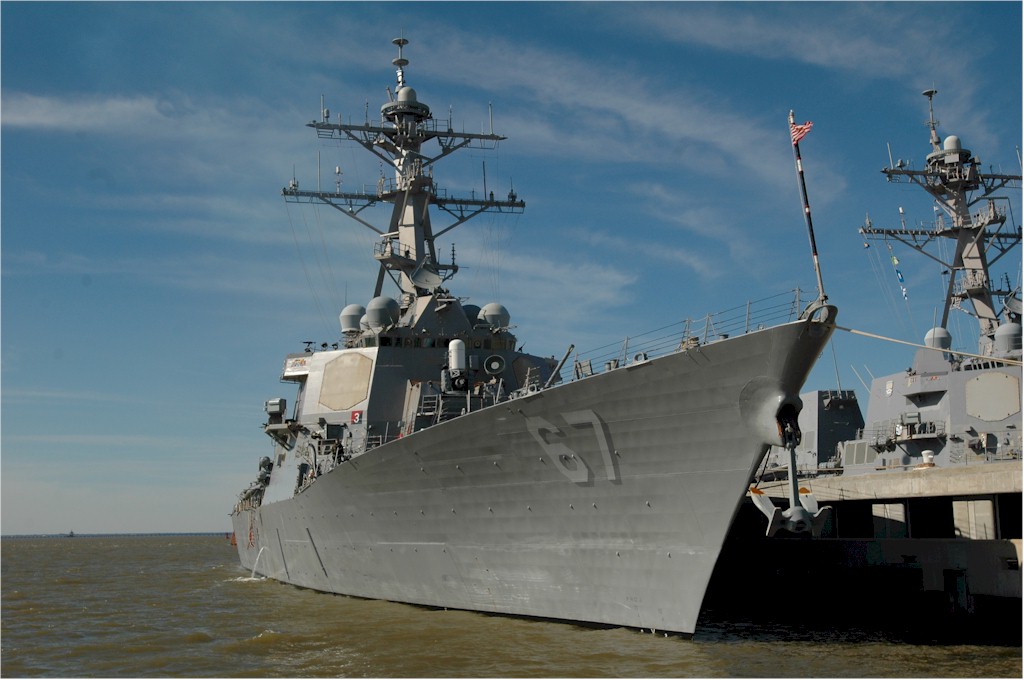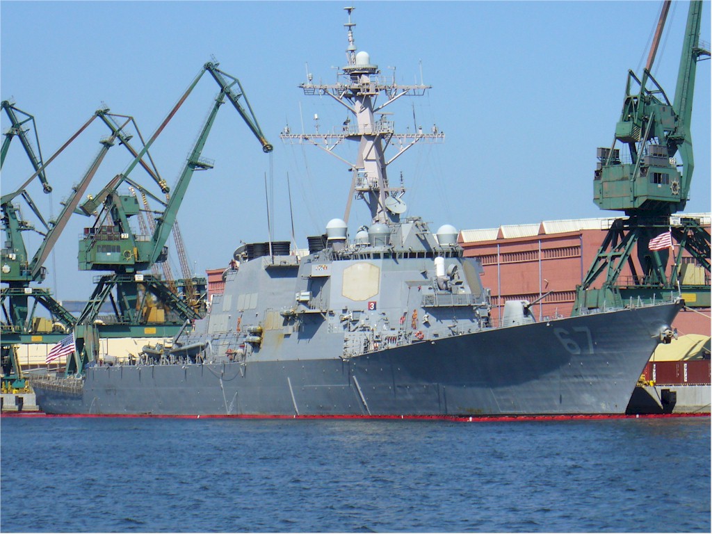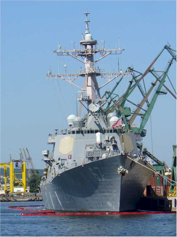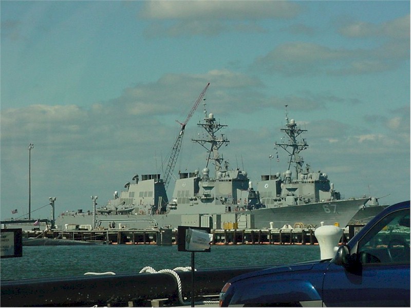 | 94k | 050205-N-0295M-002. Norfolk, VA, February 5 2005, the guided missile destroyer USS Cole (DDG 67) sits moored to the pier in her homeport of Naval Station Norfolk, Va. Guided missile destroyers operate in support of carrier battle groups, surface action groups, amphibious groups, and replenishment groups. Destroyers primarily perform anti-submarine warfare duty while guided missile destroyers are multi-mission (anti-submarine, anti-air, and anti-surface warfare) surface combatants. U.S. Navy photo by Photographer’s Mate 2nd Class Daniel J. McLain. | Bill Gonyo |