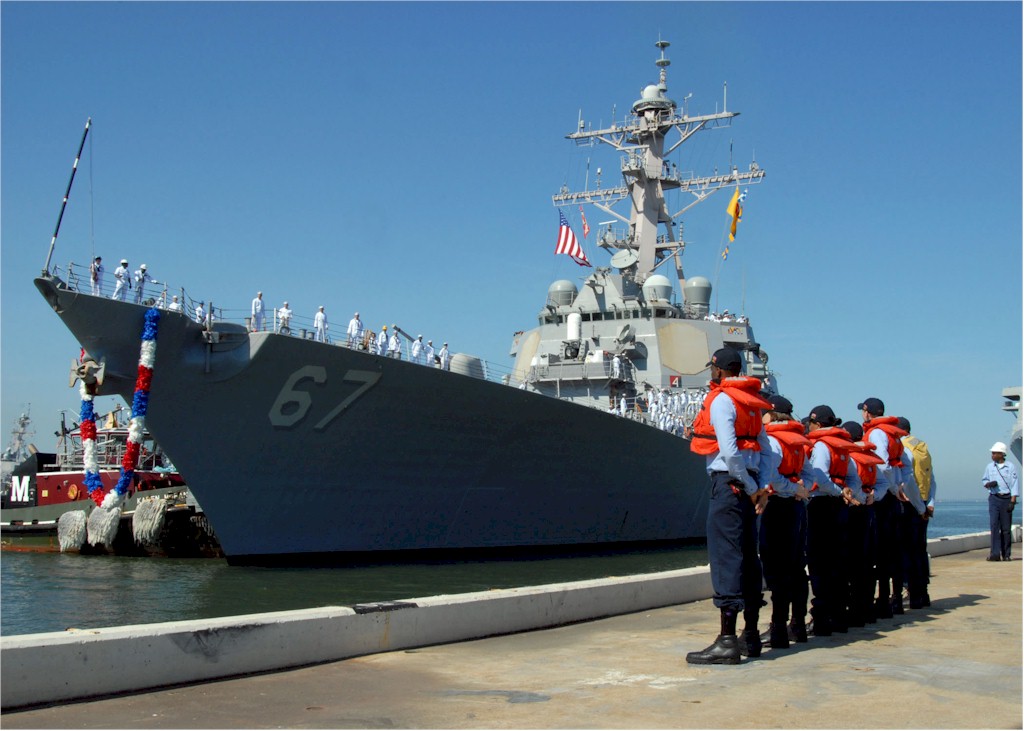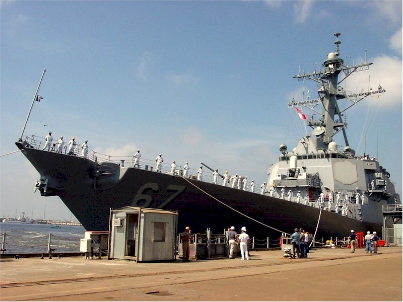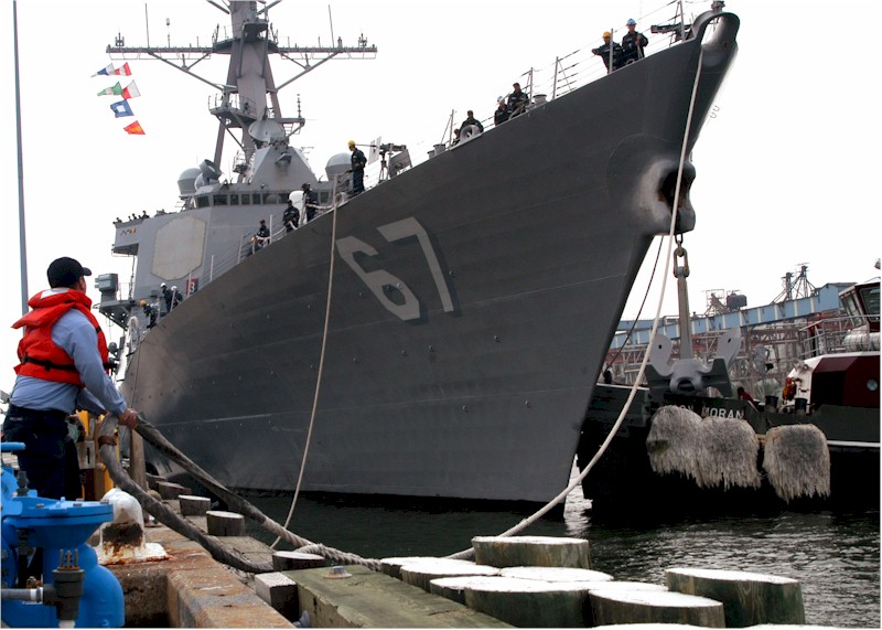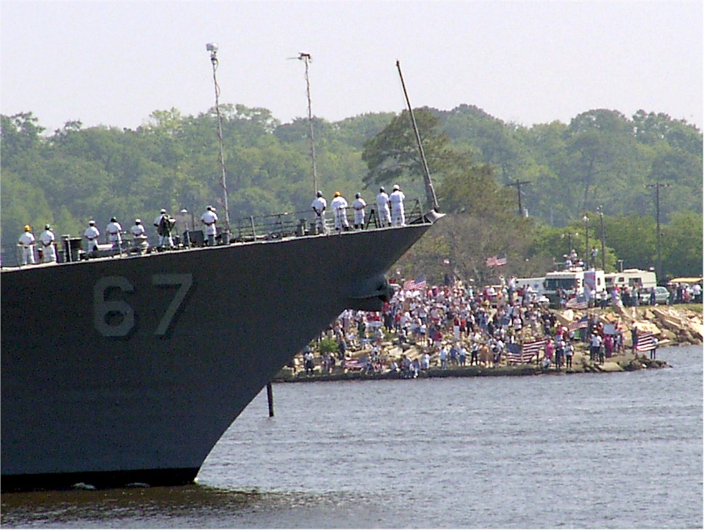 | 101k | 040527-N-7631T-019. Naval Station Norfolk, VA, May 27 2004, guided missile destroyer USS Cole (DDG 67) prepares to moor pierside during homecoming celebrations, at the conclusion of their deployment in support of the global war of terrorism (GWOT). Cole completed its first six-month deployment since October 2000 when it was hit by terrorists. Cole was assigned to the Standing Naval Forces Mediterranean (SNFM) conducting operations in support of Operation Active Endeavor. U.S. Navy photo by Photographer's Mate 2nd Class Kevin Tidwell. | Bill Gonyo |